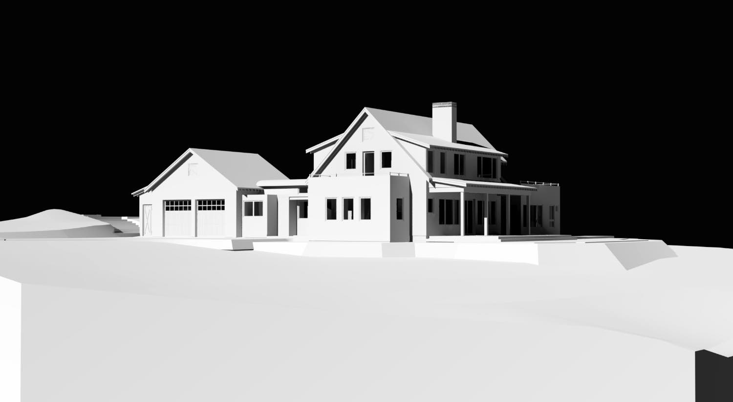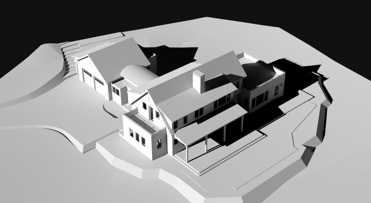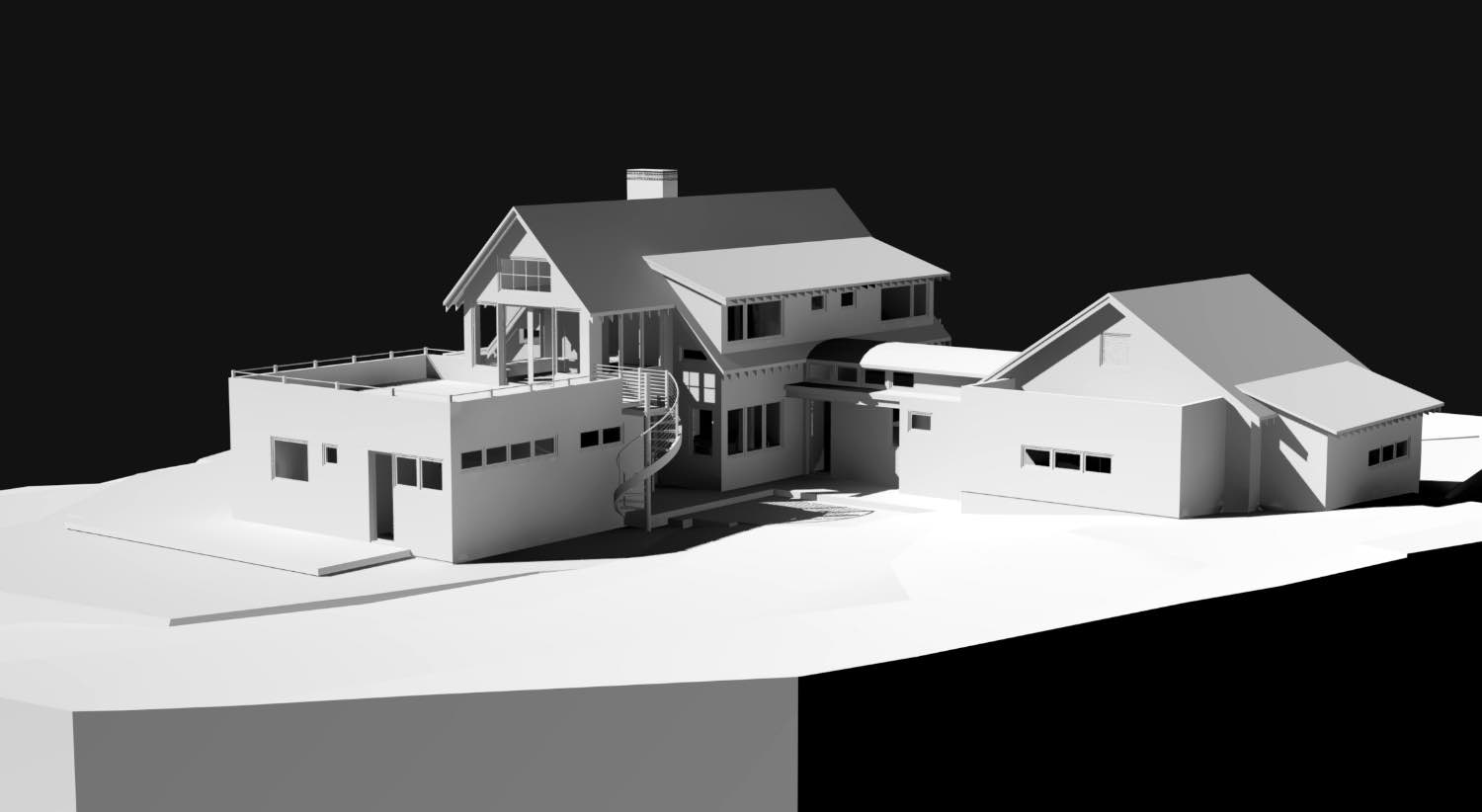 We organized this house by breaking it into separate volumes, each with its own character and purpose. The main living pavilion sits at the center with a two-story gabled form. A detached garage structure stands to one side, while lower single-story wings extend from the main house to define different program areas.