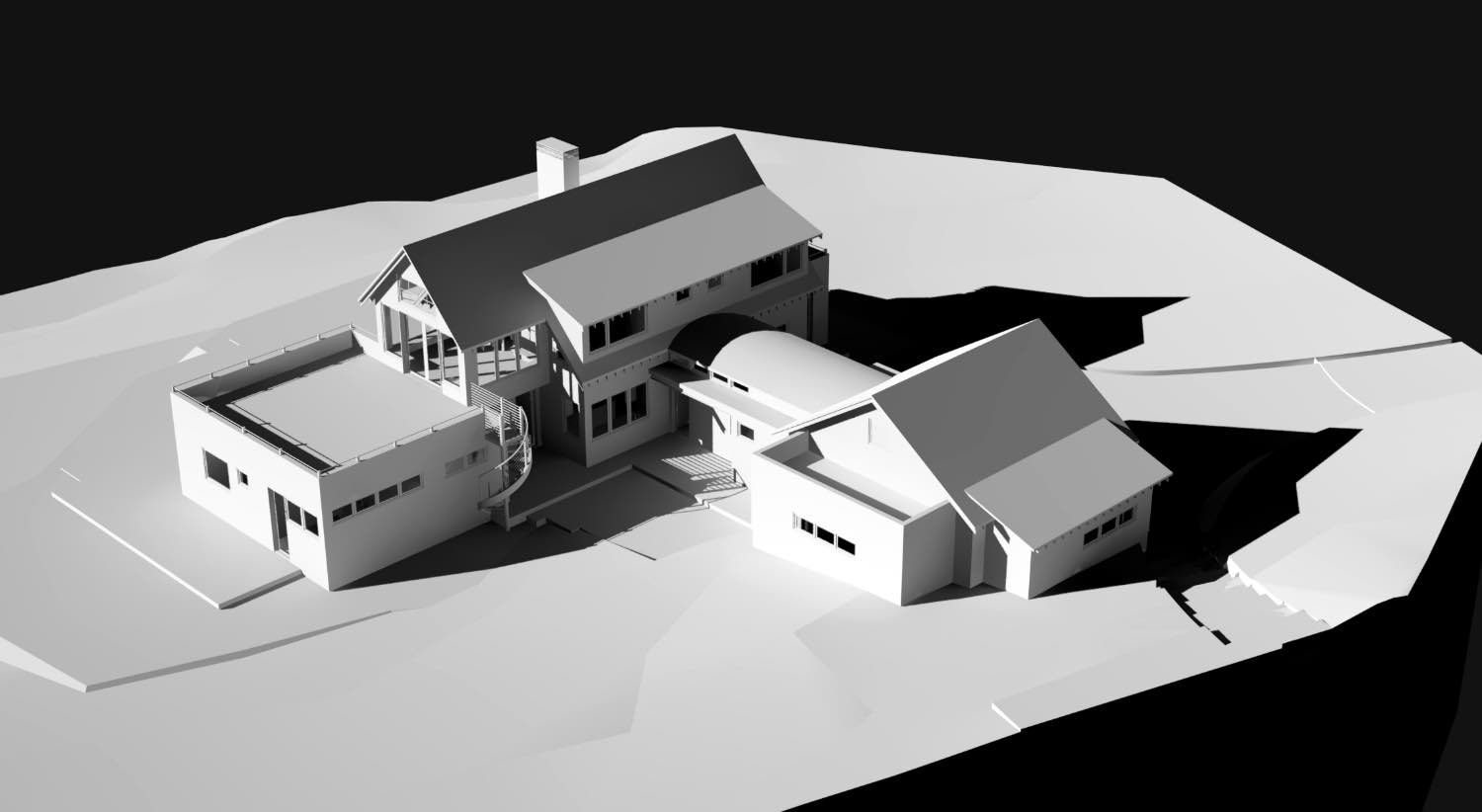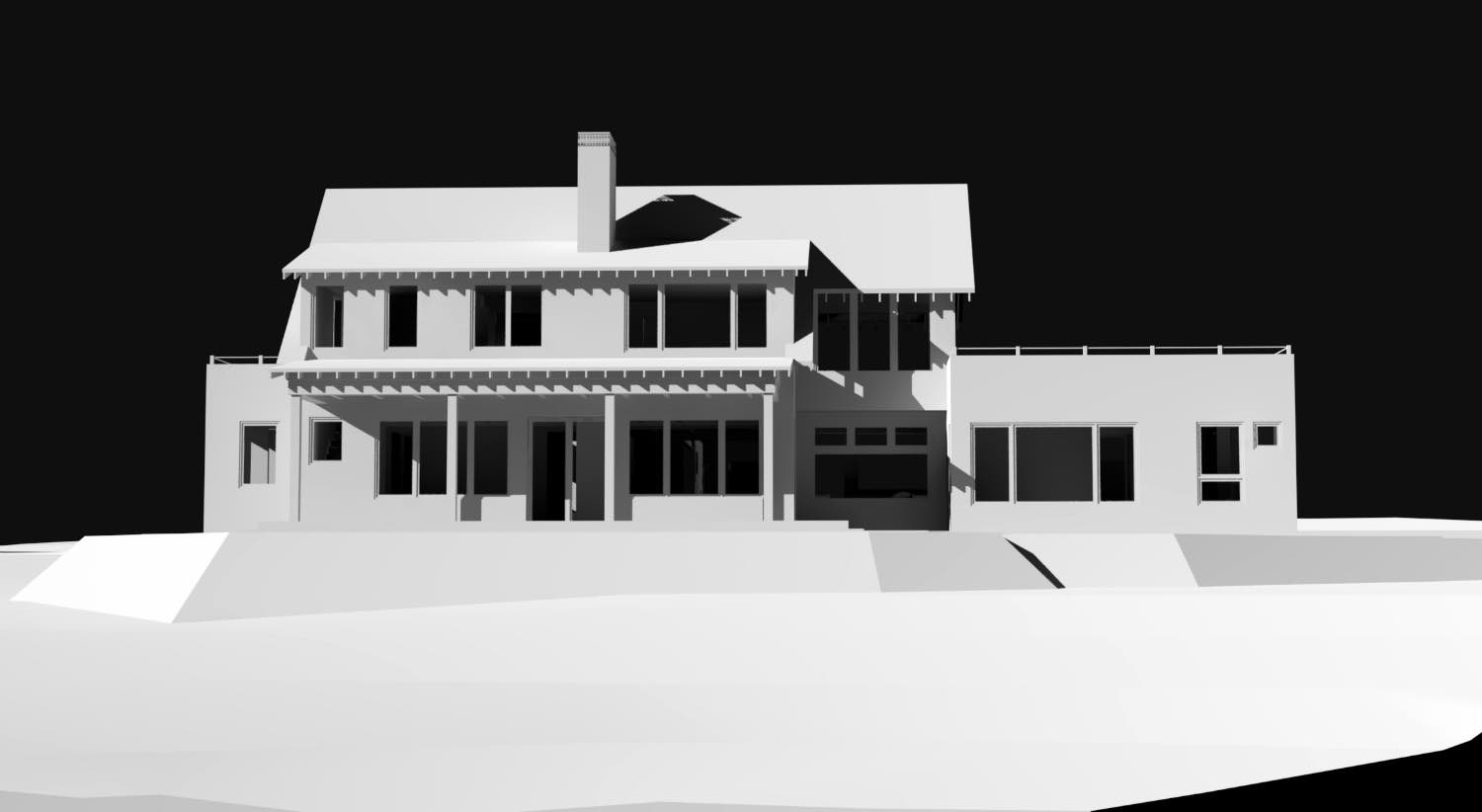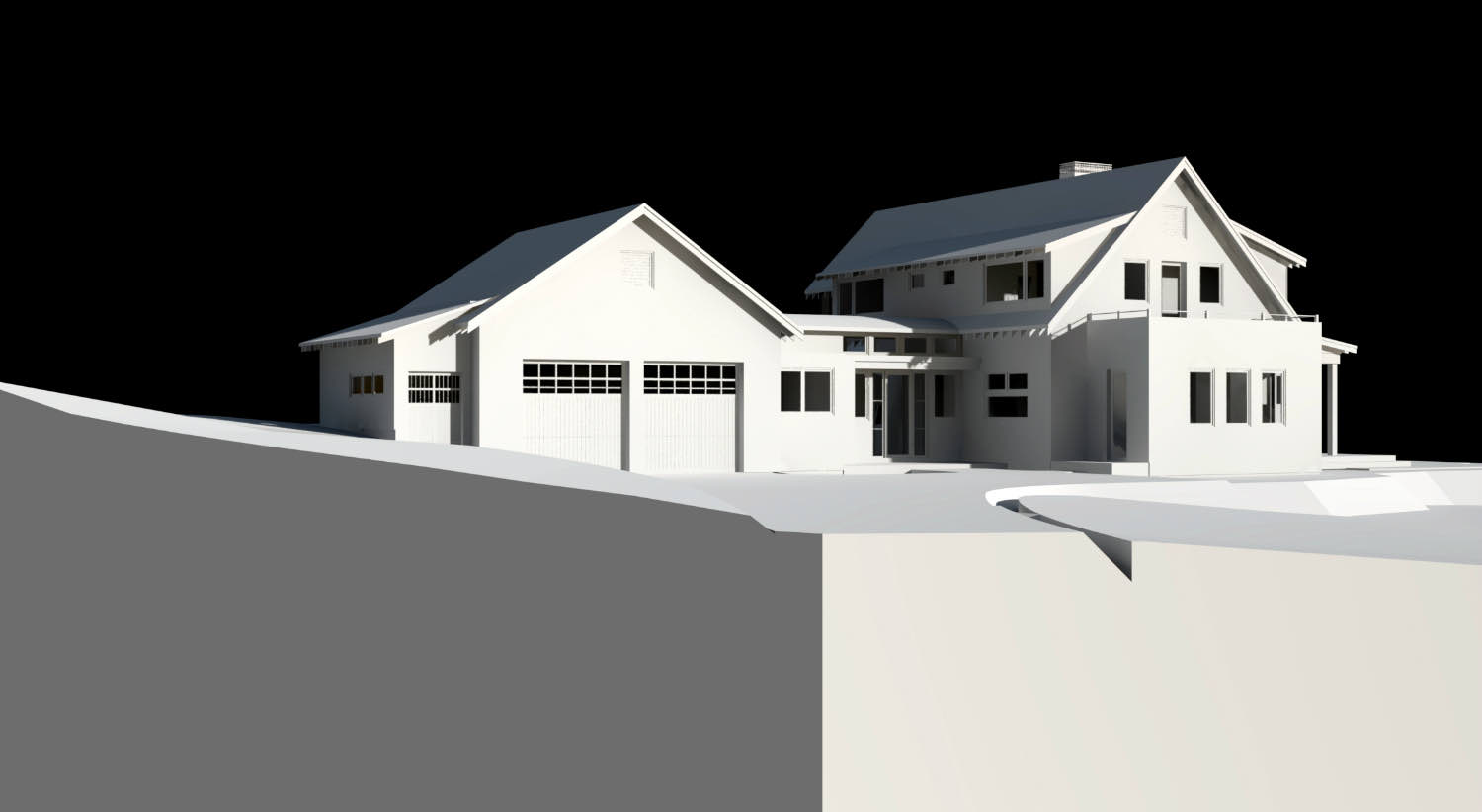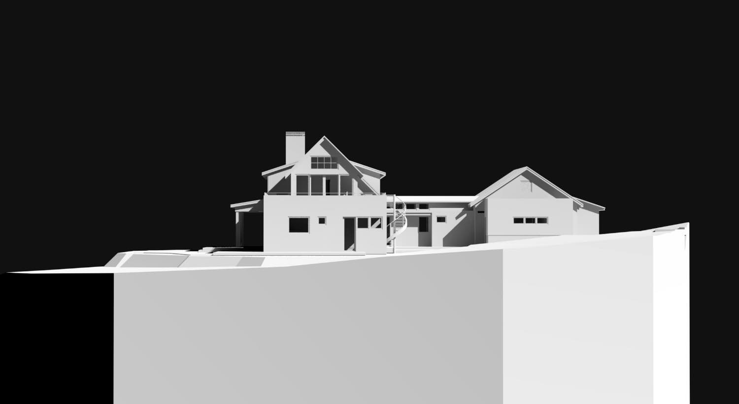 We organized this house by breaking it into separate volumes, each with its own character and purpose. The main living pavilion sits at the center with a two-story gabled form. A detached garage structure stands to one side, while lower single-story wings extend from the main house to define different program areas.