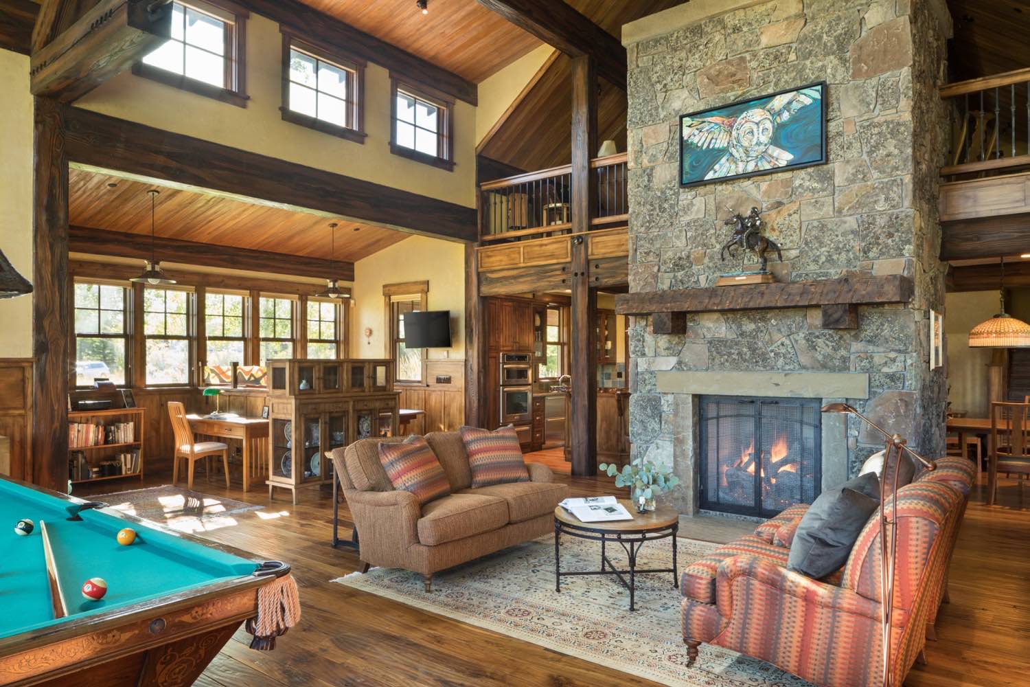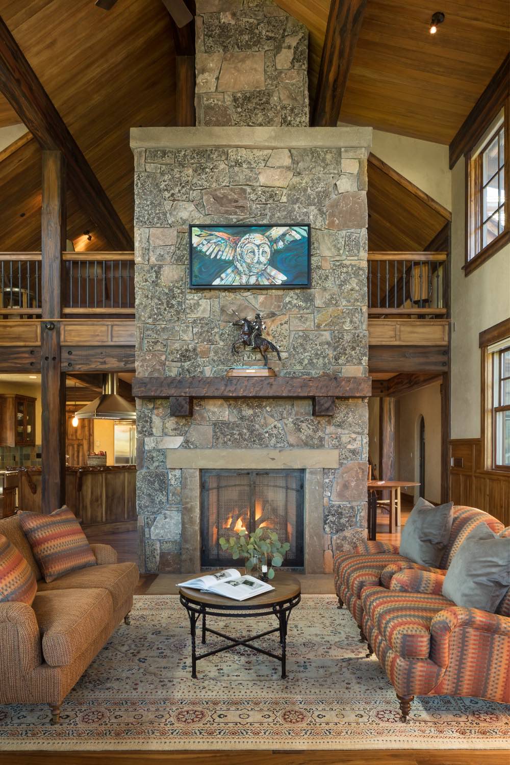 Inside, the great room rises two stories with exposed timber trusses defining the volume overhead. A floor-to-ceiling stone fireplace anchors the space, built from irregular pieces that give the surface texture and depth. The loft overlooks the main living area, with timber railings and built-in cabinetry that continues the material language.