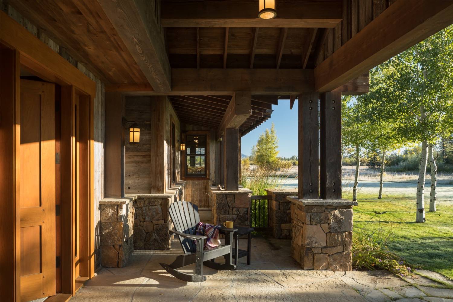 The covered porches work hard in this climate. Stone bases support heavy timber columns, creating protected outdoor rooms that face different views and catch different light throughout the day. The stonework ties directly into the landscape, literally growing from the ground.