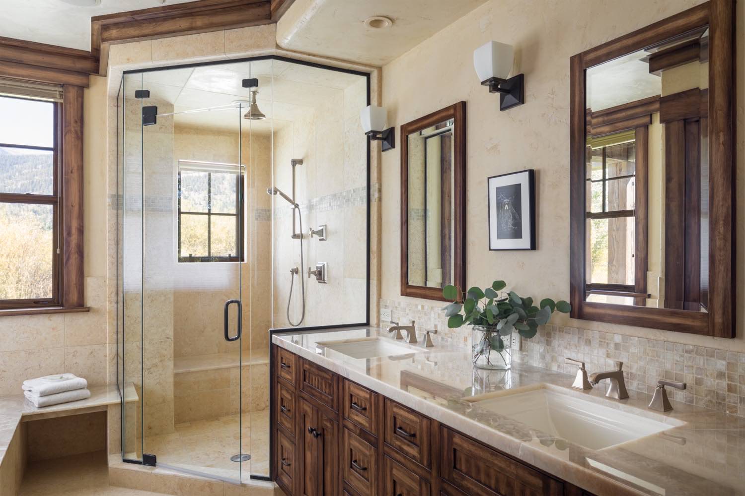 The bathroom uses travertine throughout, with the stone running from floor to walls to shower enclosure. Dark wood cabinetry and trim maintain continuity with the rest of the house while the stone lightens the palette. We sized the windows to frame specific views while maintaining privacy.