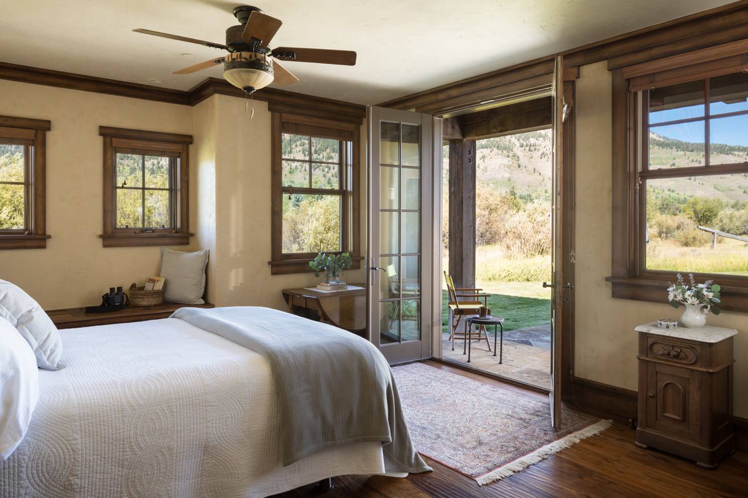 The primary bedroom opens directly to the landscape through French doors. We kept the finishes simple here with dark wood trim against lighter walls and direct access to a private terrace. Views matter more than decoration in a bedroom.