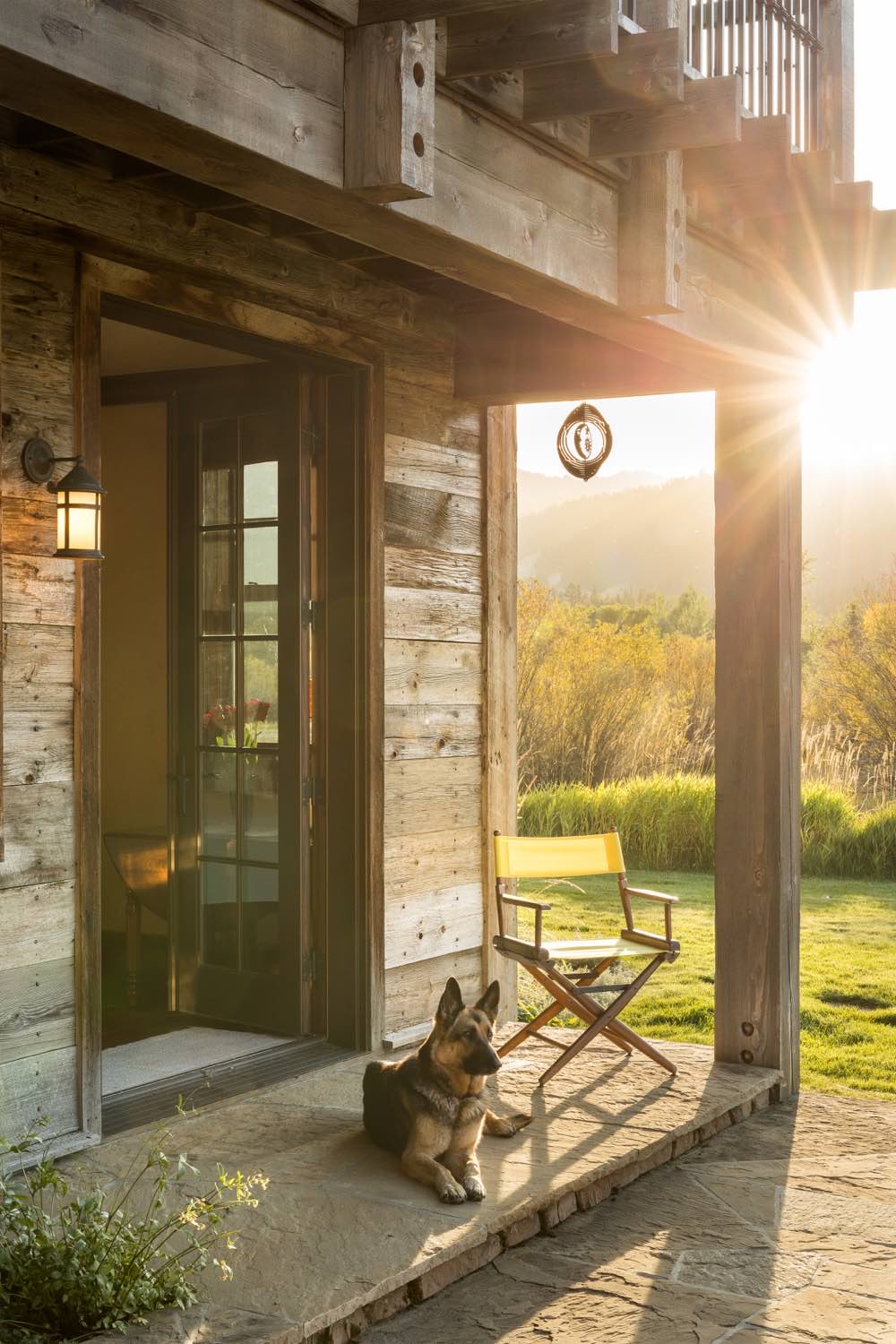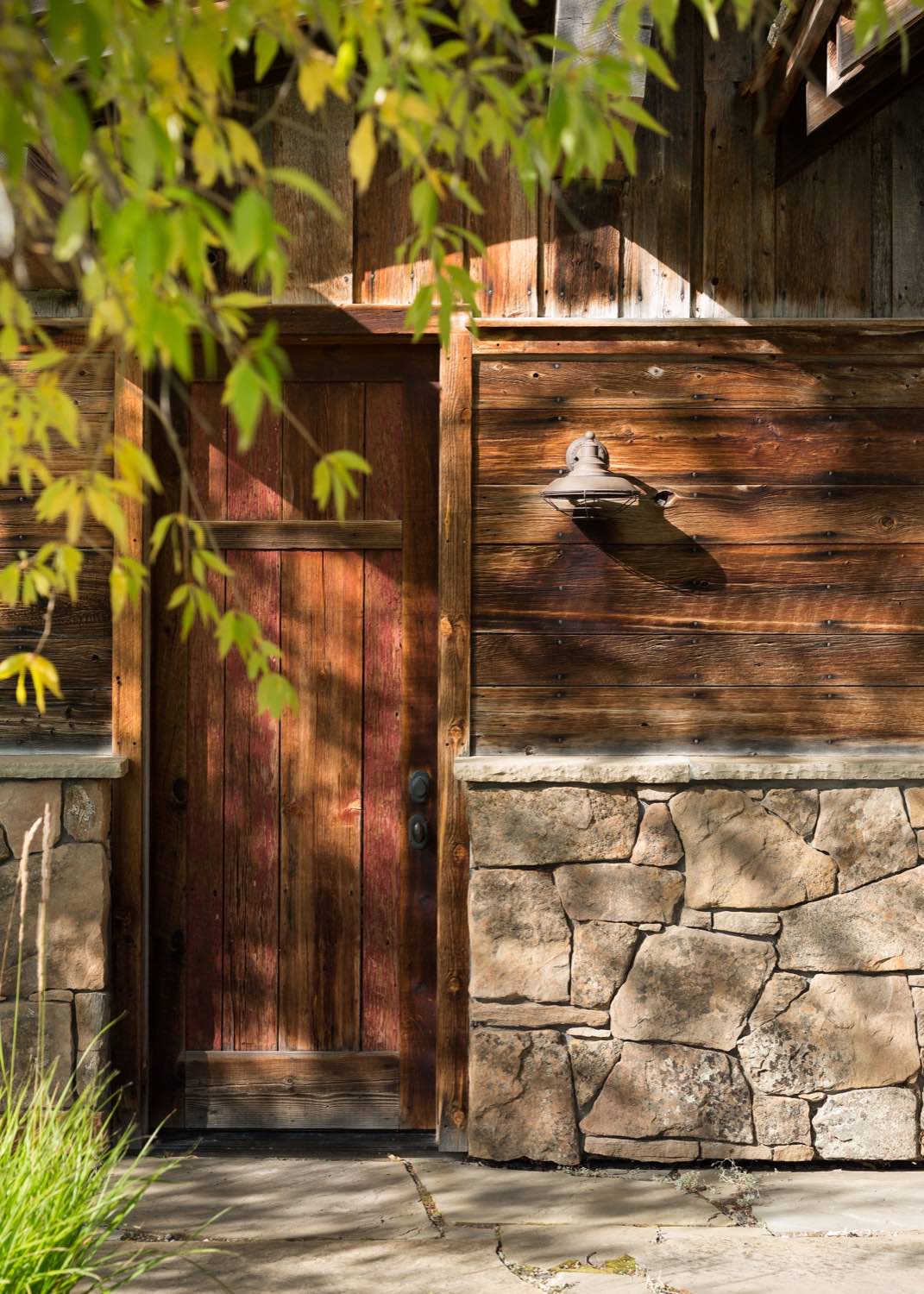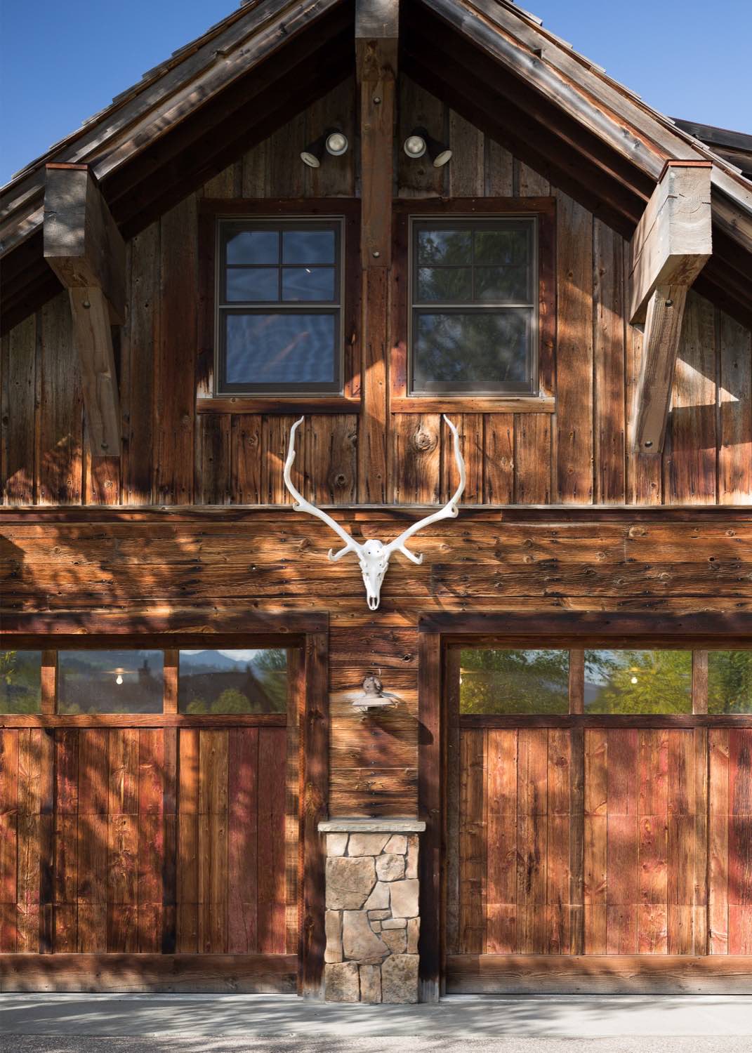 We incorporated western details where they made sense. A weathered door with iron hardware, an elk skull mounted on the timber siding, stone water table courses breaking the vertical plane. These elements feel appropriate to the location without forcing a theme.