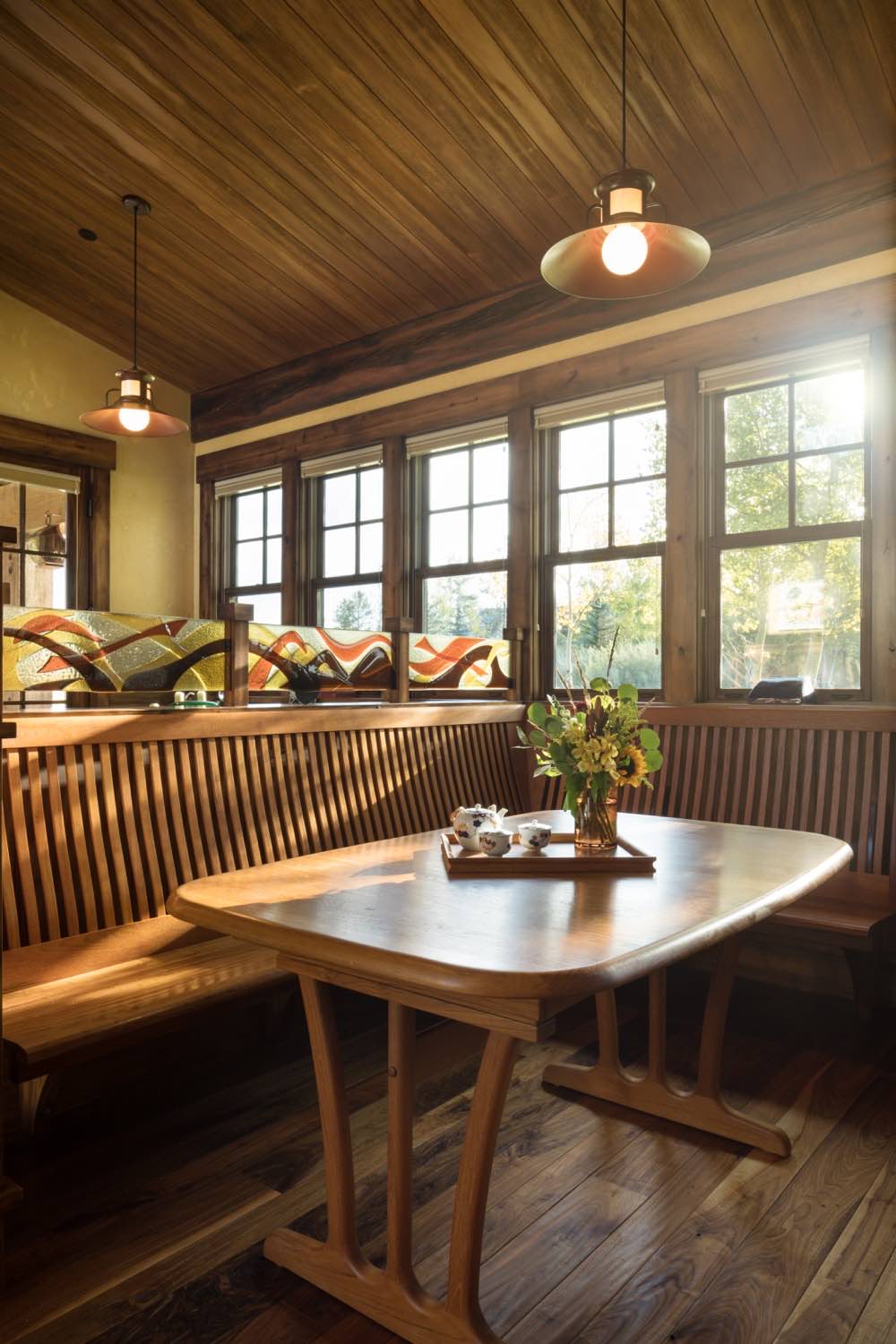 The breakfast nook wraps a built-in banquette beneath a bank of windows. Tongue-and-groove wood ceilings carry through from room to room, warm against the cream-colored walls. It's a strategy we use often: let the wood dominate the ceiling plane while keeping walls lighter to balance the overall tone.