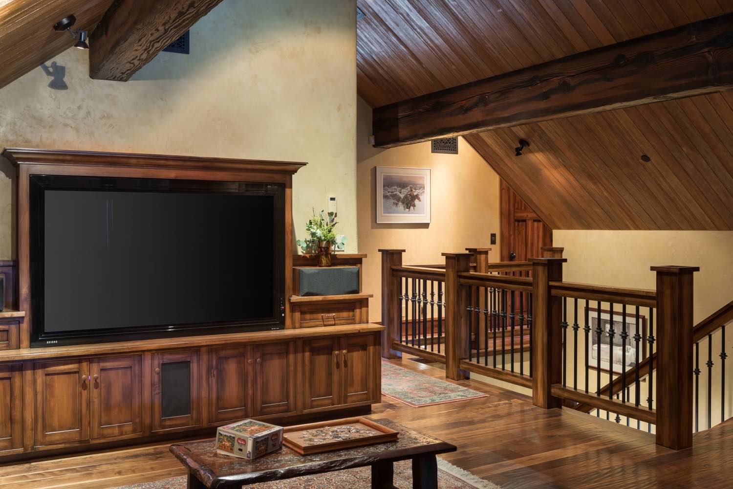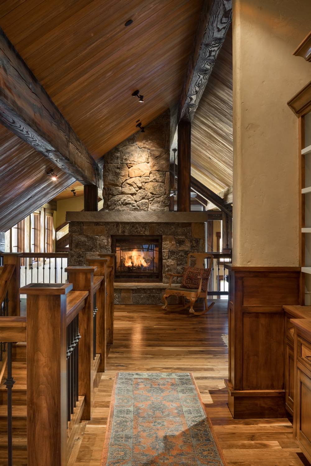 The upper level includes a media loft with timber ceiling and exposed trusses. A second two-sided fireplace serves this space and the room beyond, with stonework continuing the vertical line from the main floor below. We used timber and iron railings that feel substantial without blocking sightlines.