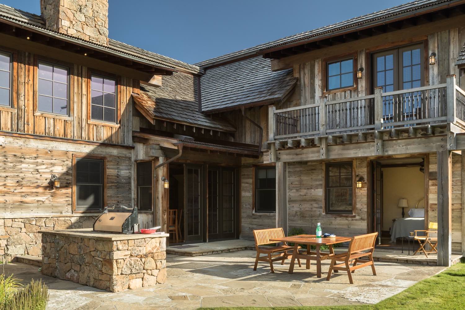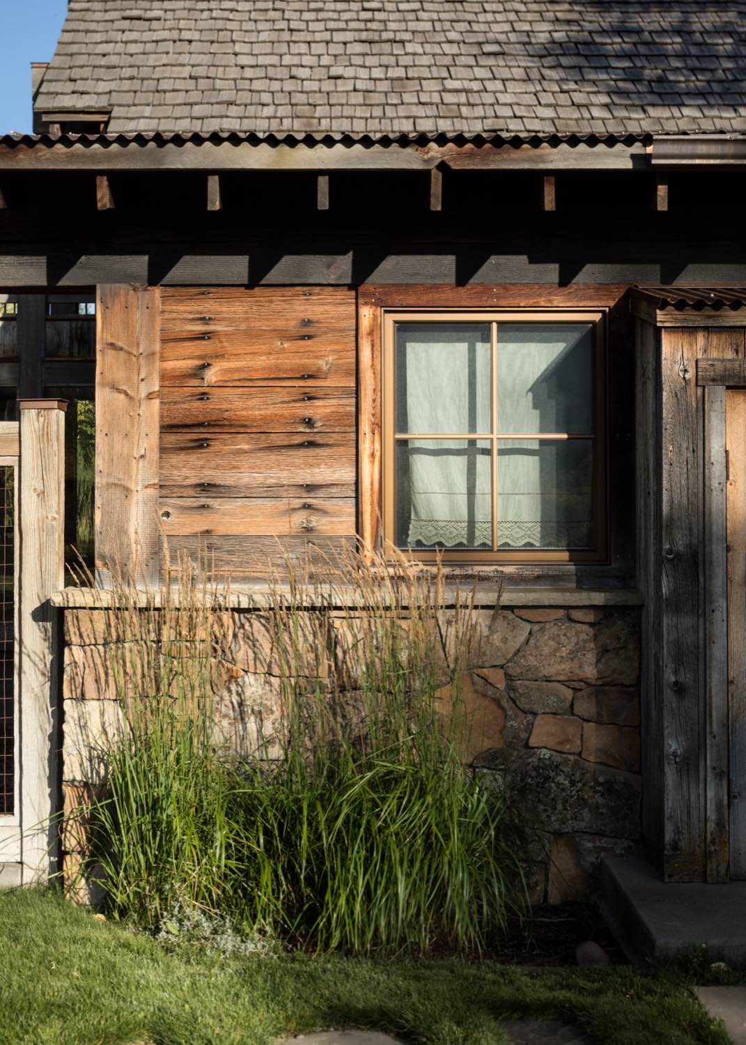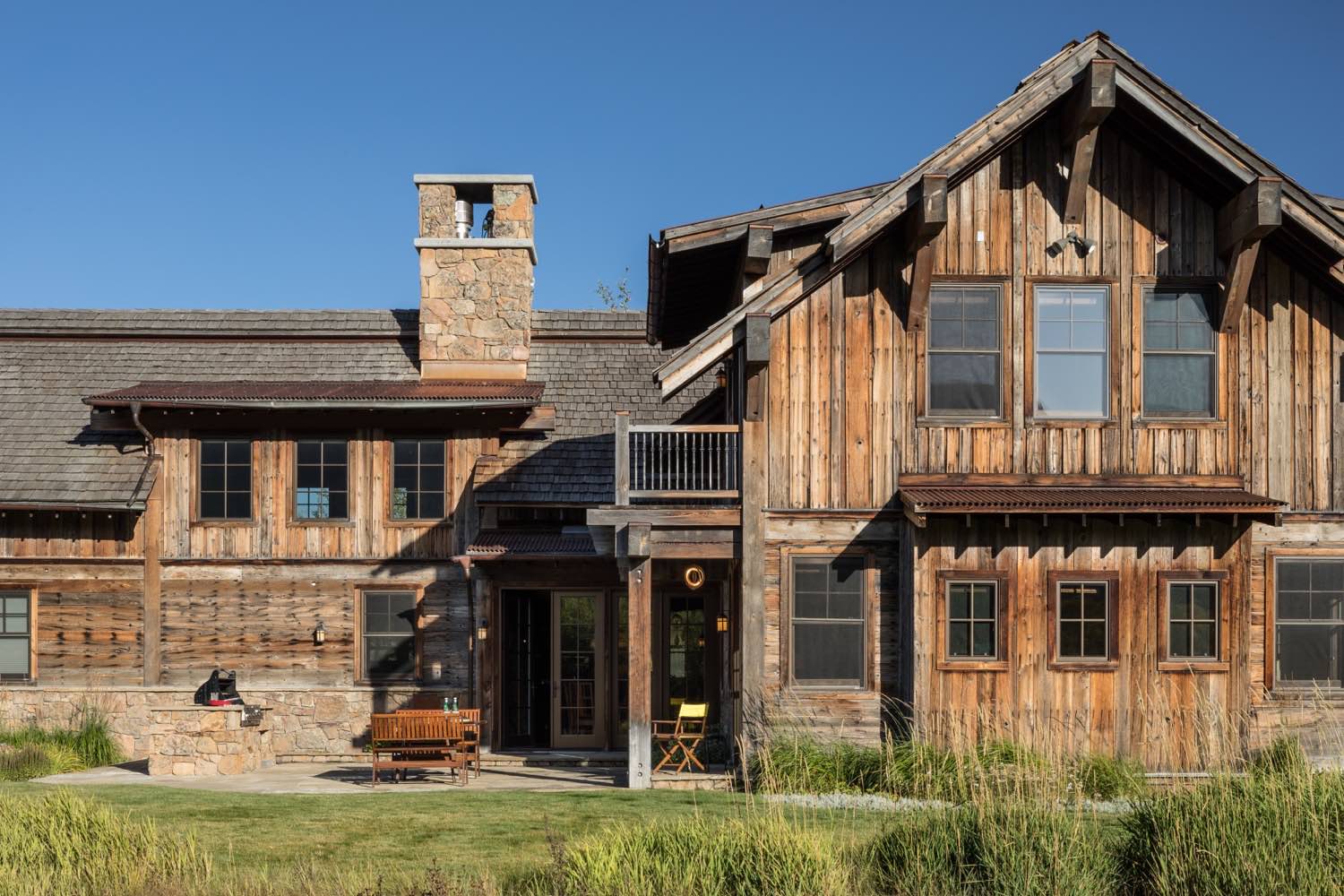We built with weathered reclaimed timber and local stone. The exterior siding shows decades of mountain weather in its grain, ranging from deep charcoal to warm honey tones where the sun has worked the wood. It's not uniformly aged, which is the point. Real weathering happens unevenly, following sun and wind patterns, and that irregularity gives the house character you can't manufacture.