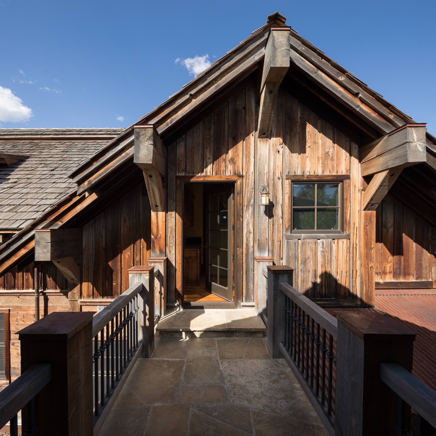 Upper terraces and balconies extend the interior spaces outside. We used timber balustrades and flagstone flooring that handles weather and connects visually to the stone base below. The weathered siding shows its full range of tones in these detail shots.
