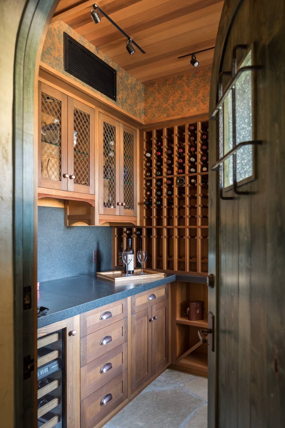We tucked a wine room off the main spaces with custom millwork and floor-to-ceiling bottle storage. The space shows how smaller rooms can carry the same material palette with more intimate scale. Copper-toned plaster on the ceiling adds warmth and reflects light from the wood fixtures.