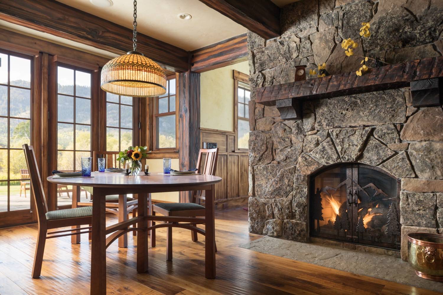 A secondary dining area features another stone fireplace, this one more vertical in proportion with a timber mantel and decorative stonework. Windows on three sides connect this space to the landscape while the fireplace provides a focal point for gathering.