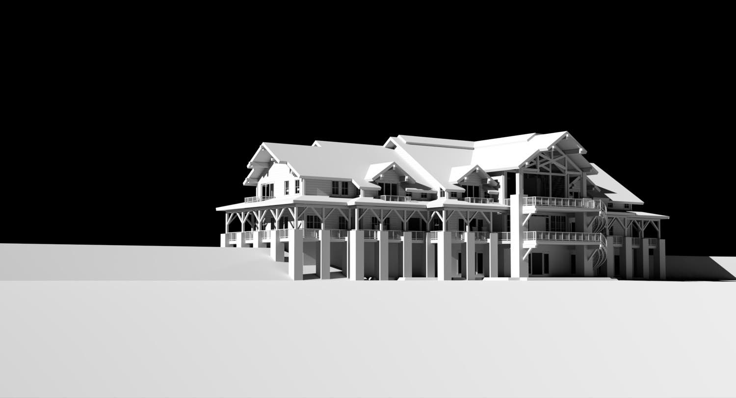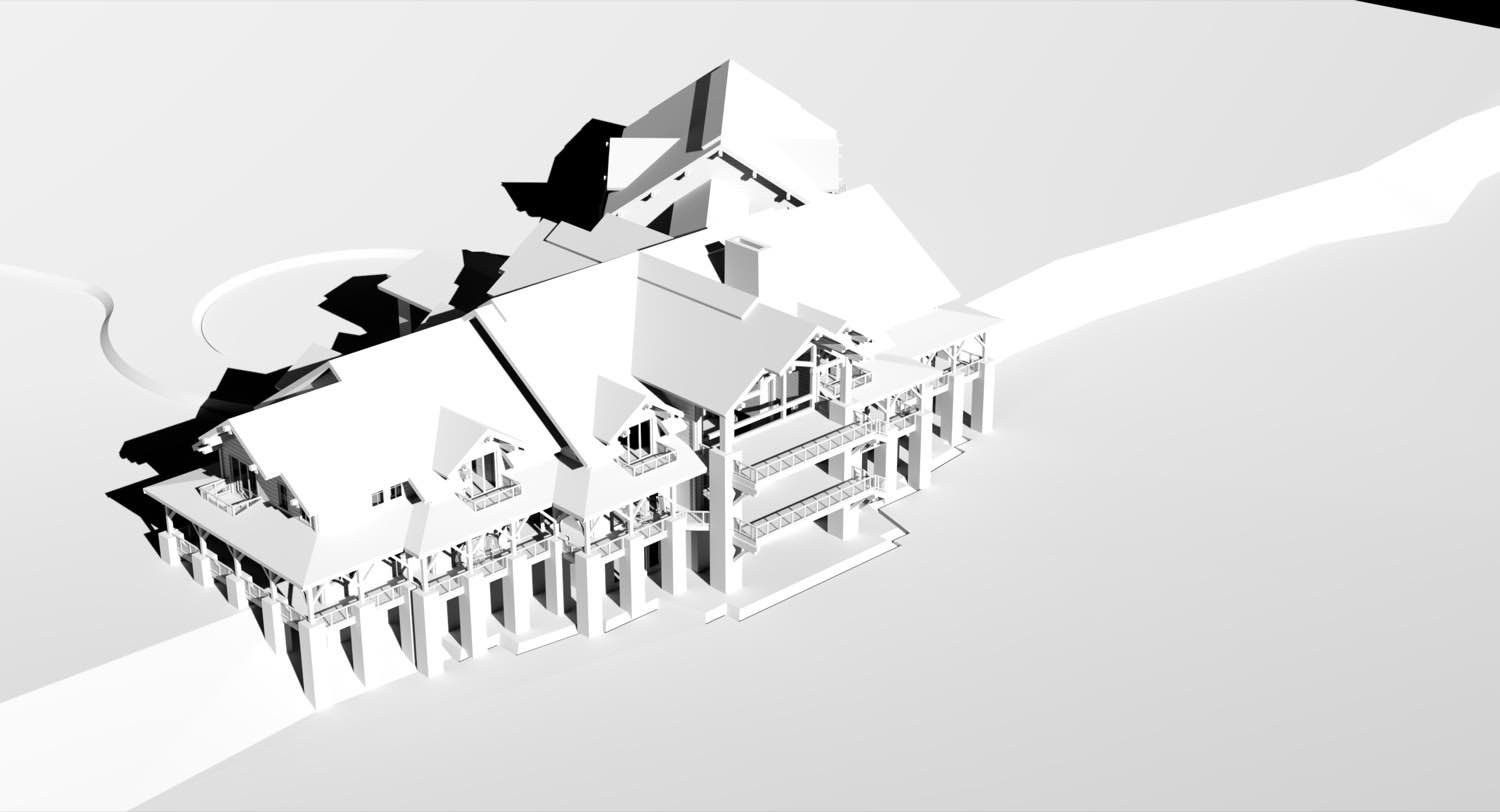 We varied the gable orientations to avoid monotony and to respond to different view directions from inside. Some volumes open to one side, others face forward. It keeps the composition interesting from multiple angles while maintaining the overall coherence of the timber system.
