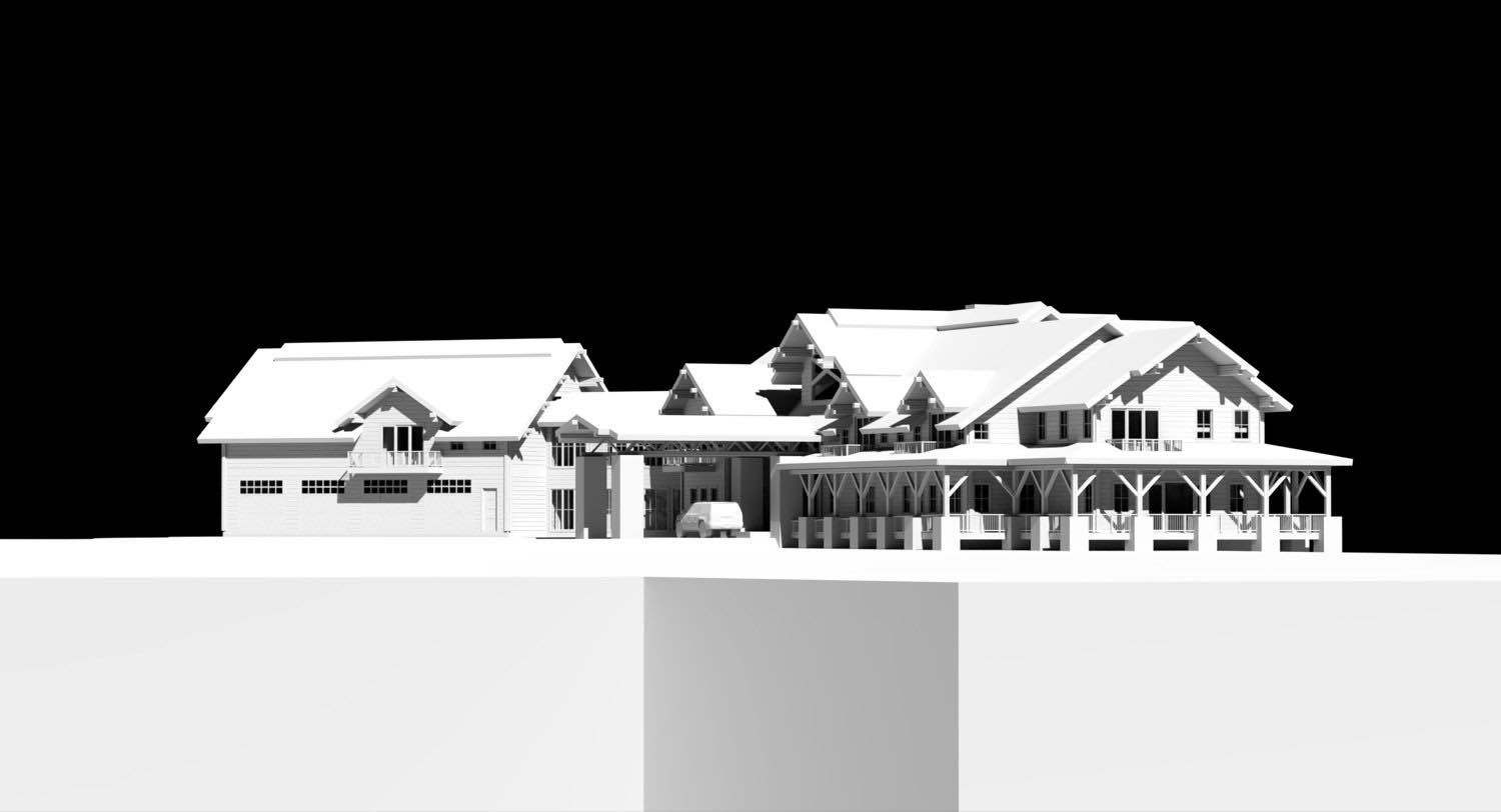 The building breaks down into distinct volumes connected by the continuous timber colonnade. This approach solves a few problems at once. It gives us flexibility in the roof forms, lets us vary ceiling heights where we need them, and keeps the overall mass from reading as one overwhelming block.