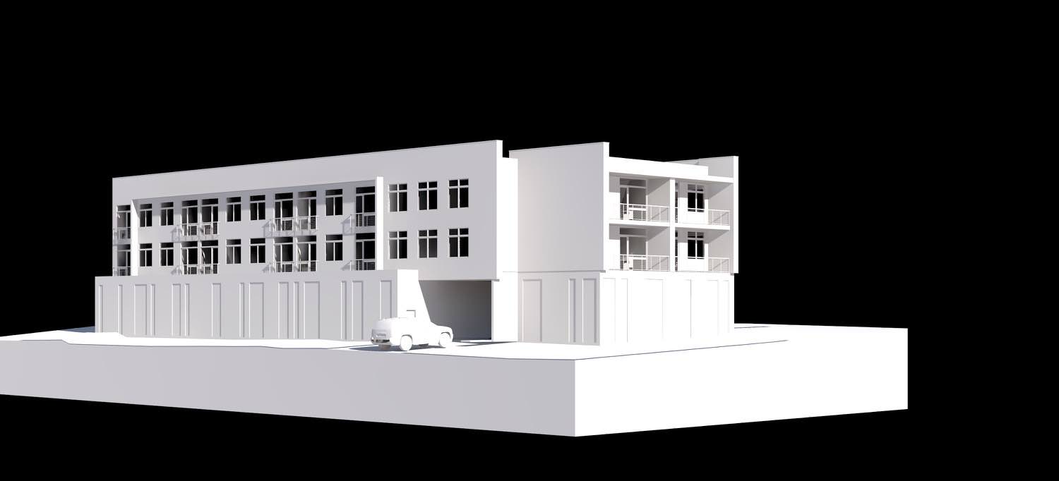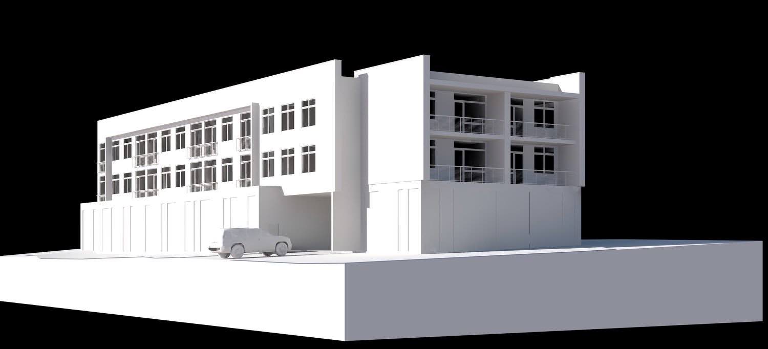 The ground level uses vertical panel articulation to differentiate the entry and garage zones from the upper residential floors. This breaks down the scale of the building as it meets the street and helps the lofts read as individual units rather than one monolithic structure. We kept the material palette simple and let the building's proportions and the play of light on the facade do the work.