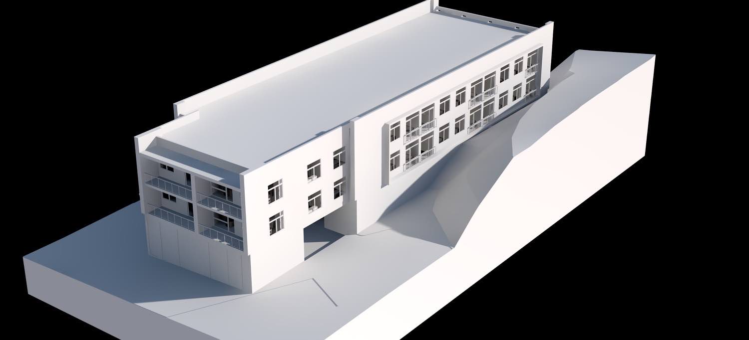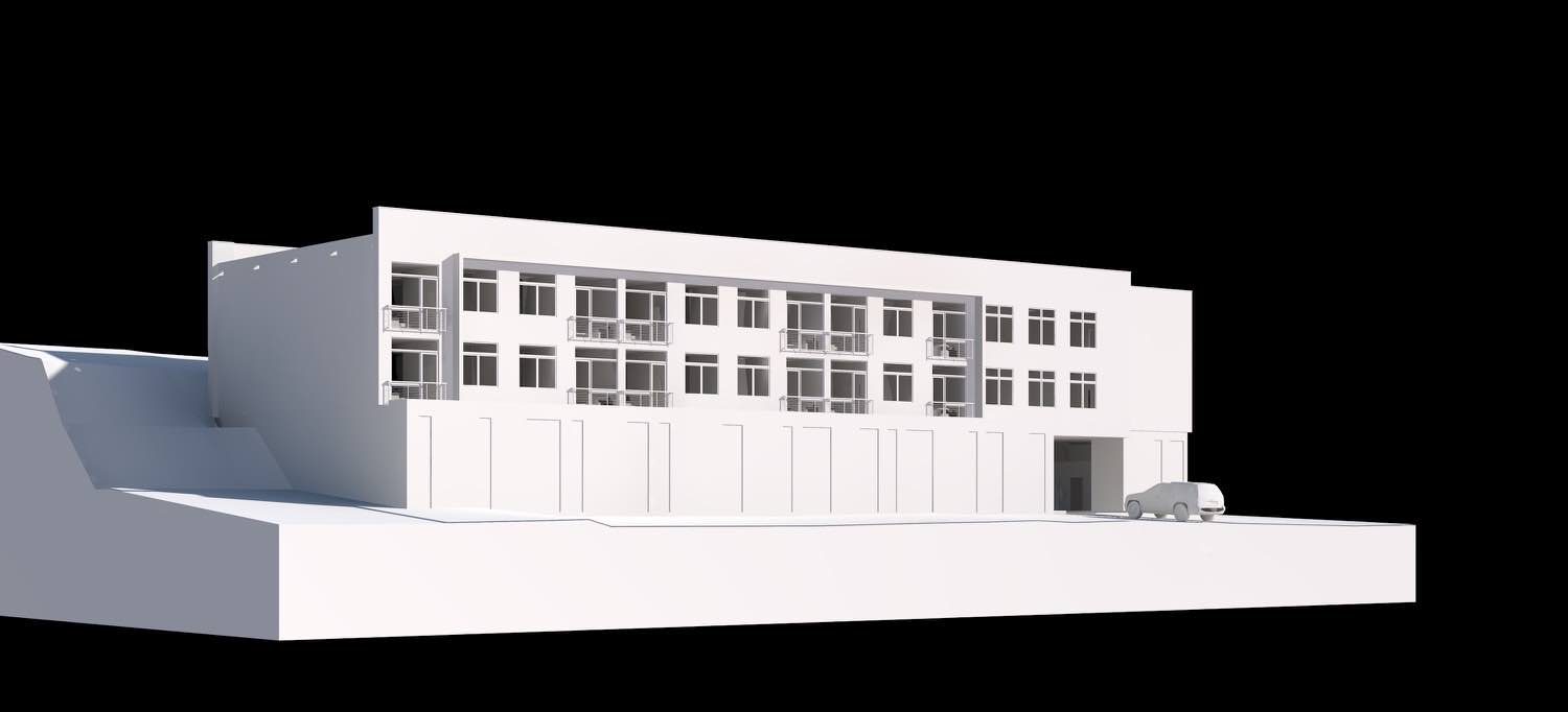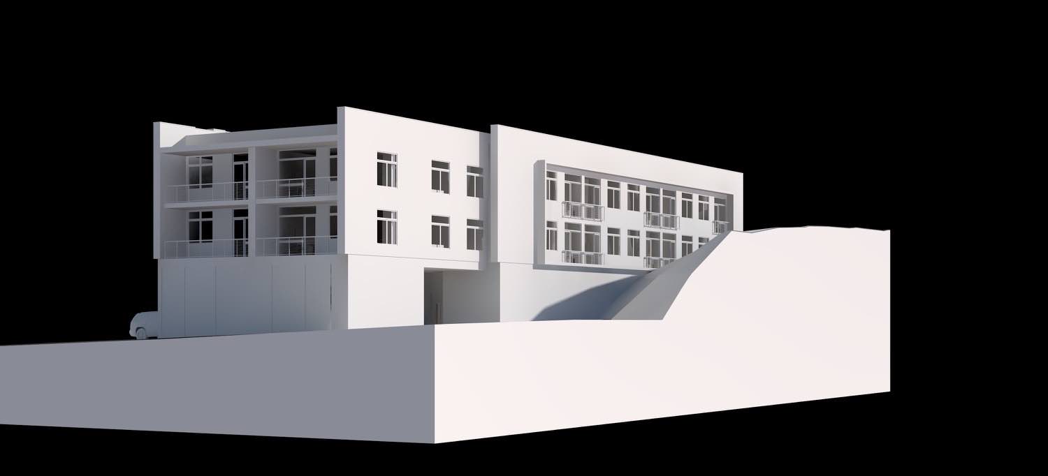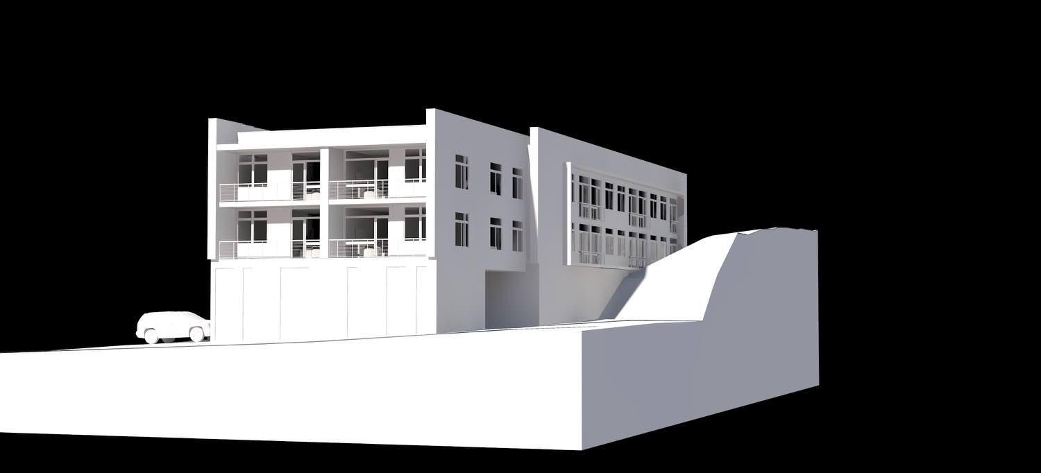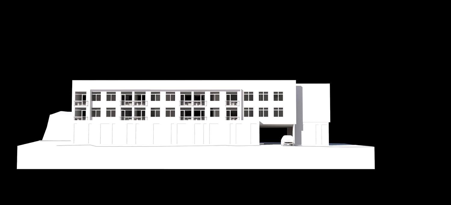The topography presented both challenge and opportunity. As the site drops away, the building steps with it, which allowed us to tuck parking and utilities into the lower level without sacrificing ceiling height in the residential spaces above. The massing breaks into distinct volumes that respond to the grade, making the building feel like it belongs on the site rather than fighting it.