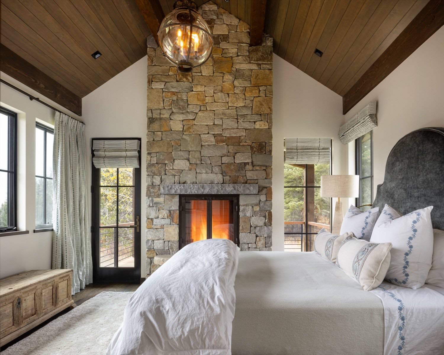 The bedrooms balance privacy with views. Stone fireplaces anchor each room, and the windows are carefully sized and positioned to frame specific views rather than maximize glazing for its own sake. This approach creates more comfortable, human-scaled spaces.