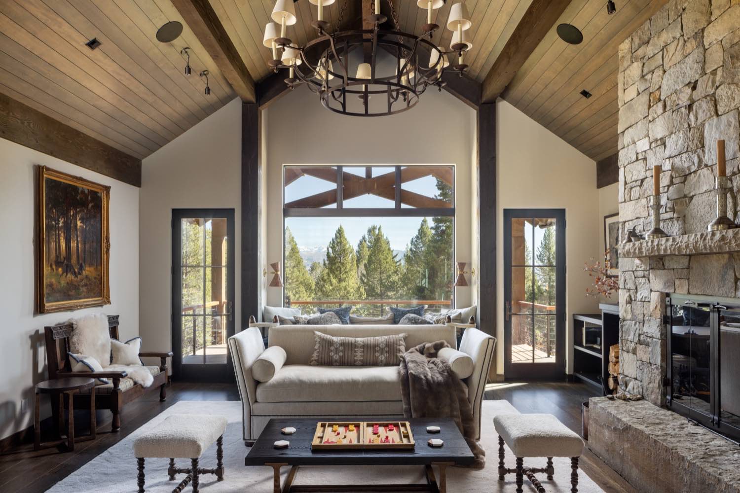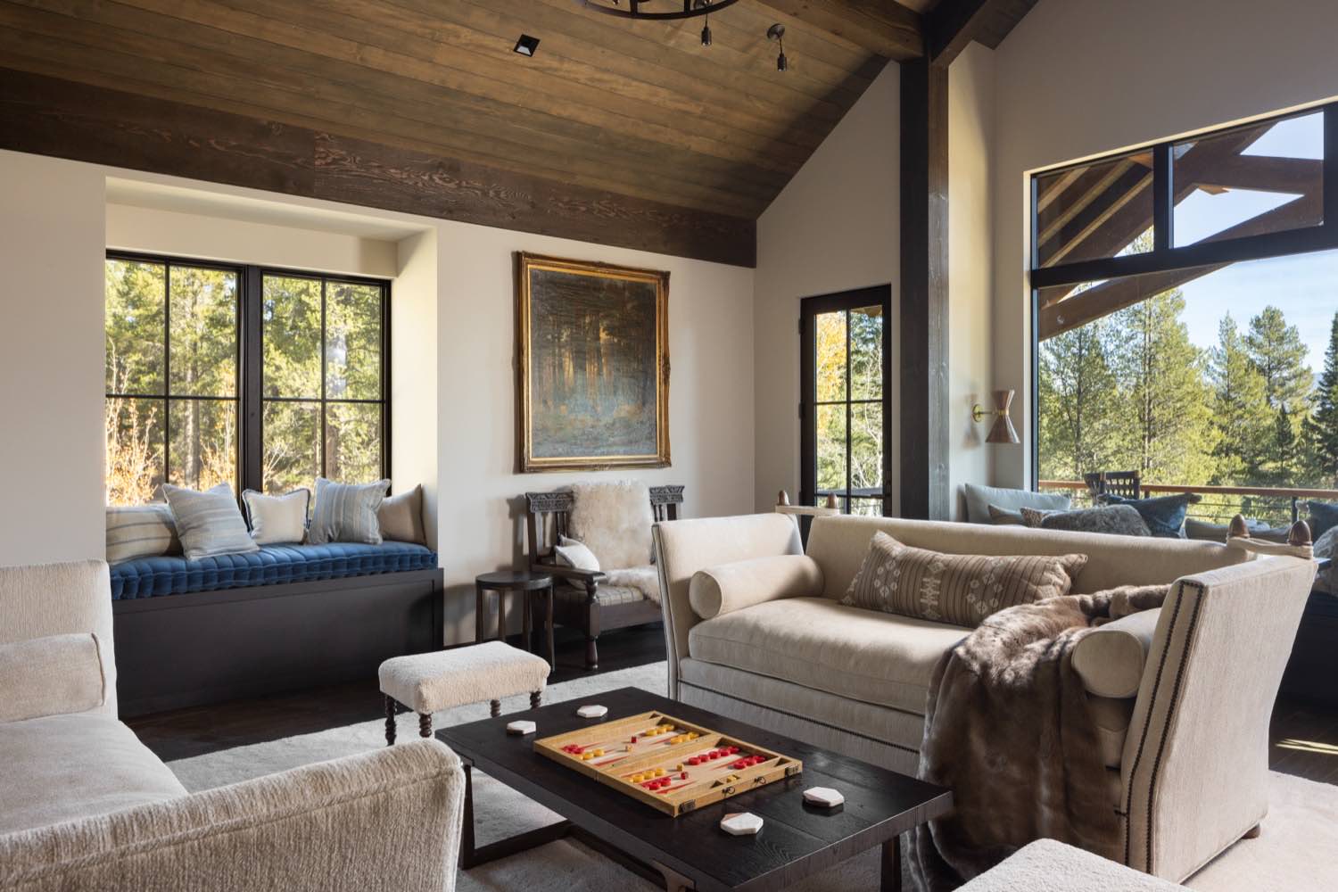 The great room centers on a floor-to-ceiling stone fireplace. Large windows on either side and above frame the views while maintaining the fireplace as the focal point. The exposed timber trusses span the vaulted space overhead, and a window seat built into the far wall creates an intimate spot within the larger volume.