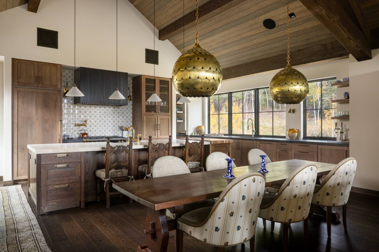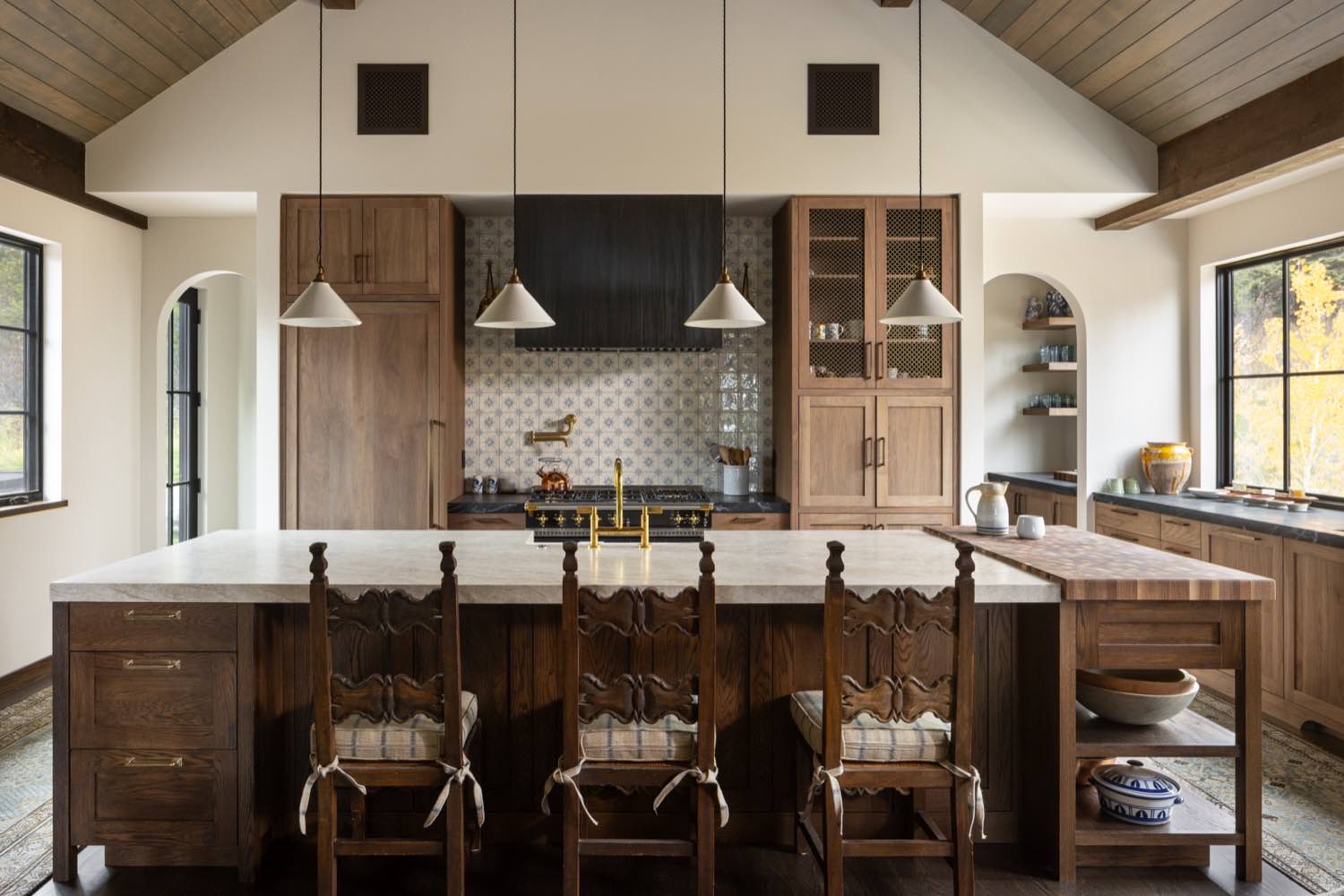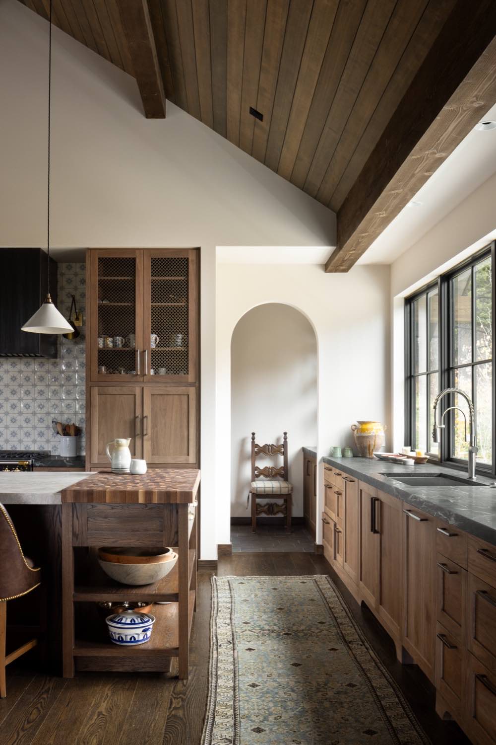 The kitchen needed to handle serious use while maintaining the aesthetic. We designed walnut cabinetry with wire mesh inserts on the upper cabinets, a detail that adds texture without feeling precious. The patterned tile backsplash provides visual interest against the range, while honed stone counters offer a softer alternative to polished surfaces. An arched passageway connects to adjacent spaces, a simple architectural gesture that reinforces the traditional roots of the design.
