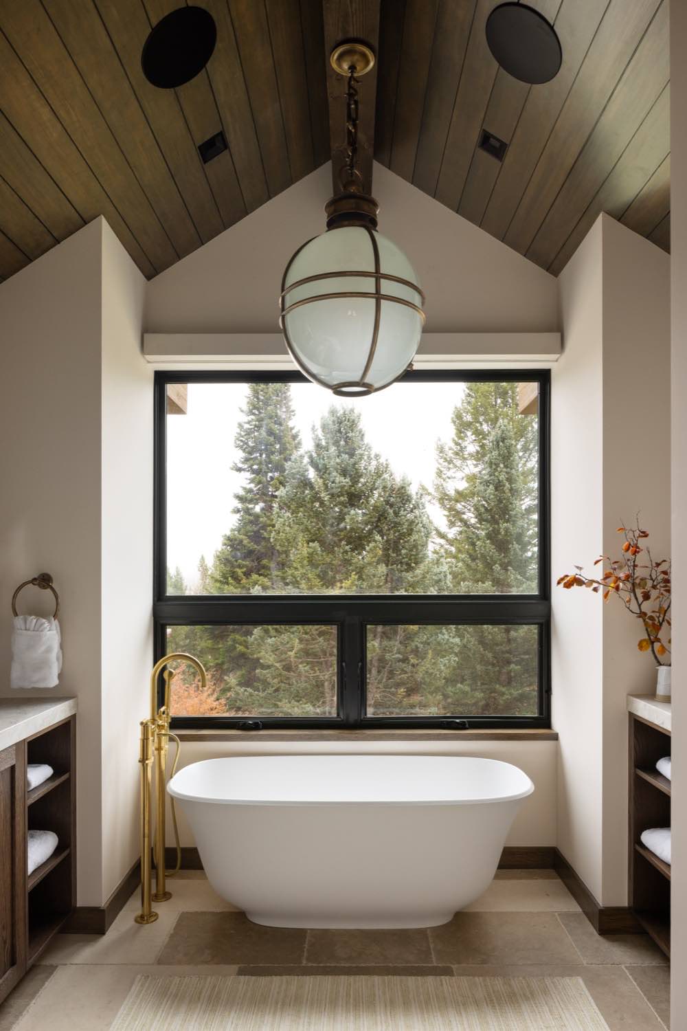The primary bathroom shows restraint. A freestanding tub sits below a large window framing the forest beyond. The vaulted wood ceiling and minimal fixtures keep the focus where it belongs, on the experience of the space and the connection to the landscape outside.