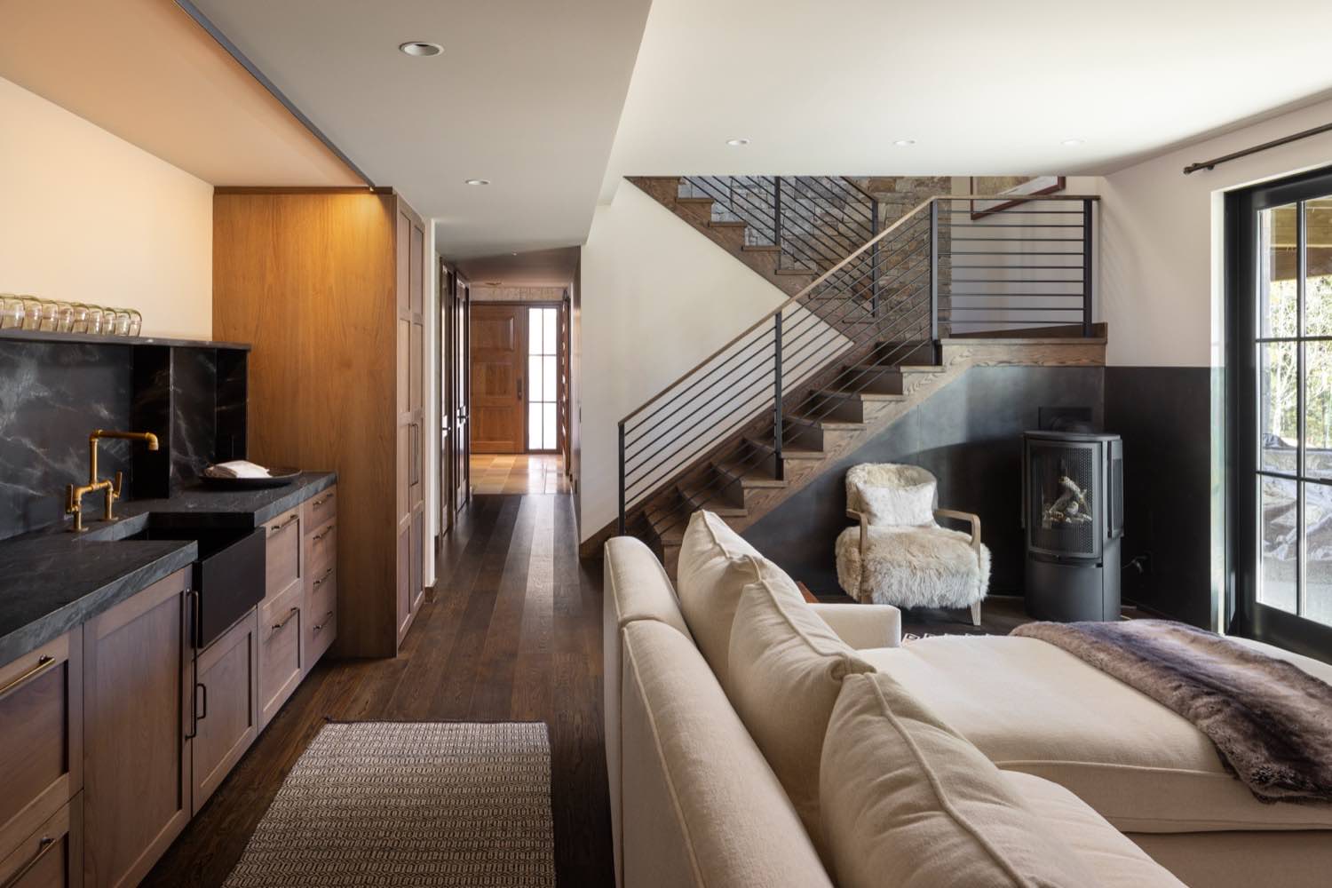 The stair hall connects the levels with a custom steel and wood stair. The stone accent wall continues from below, maintaining material continuity through the vertical circulation. We positioned a freestanding stove here, making this transitional space feel more like a destination.