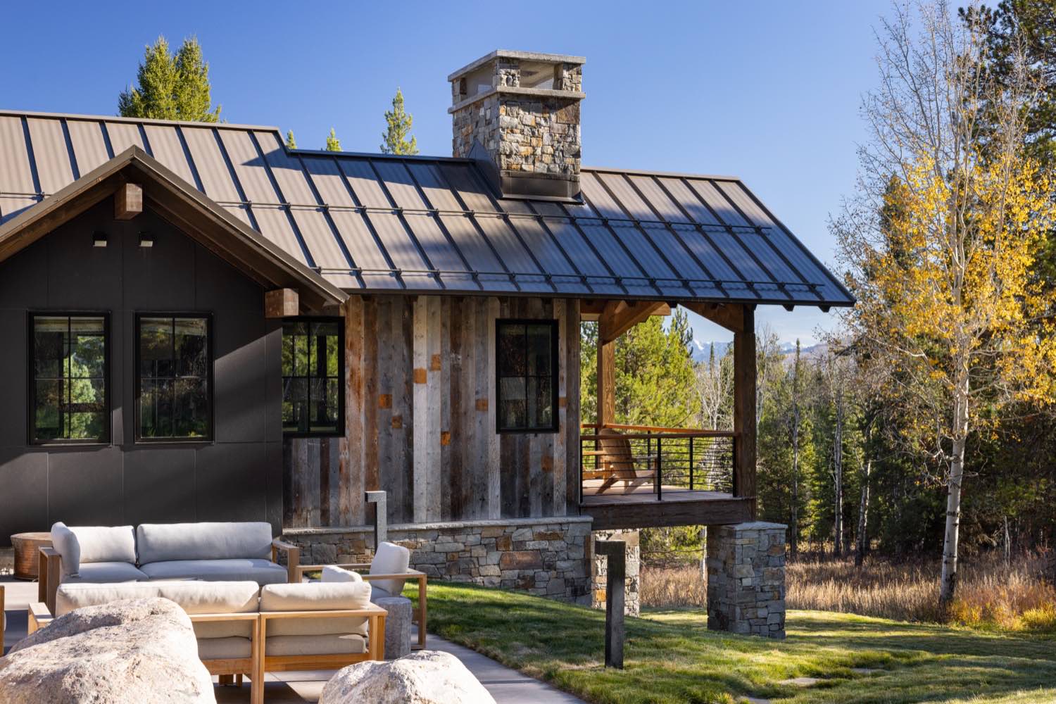 This house sits in a meadow with mountains rising behind it. The approach reveals a composition of connected volumes under standing seam metal roofs, each gable marking a different space within. We organized the plan this way to break down the scale and create a house that feels like it belongs in this landscape rather than dominates it.