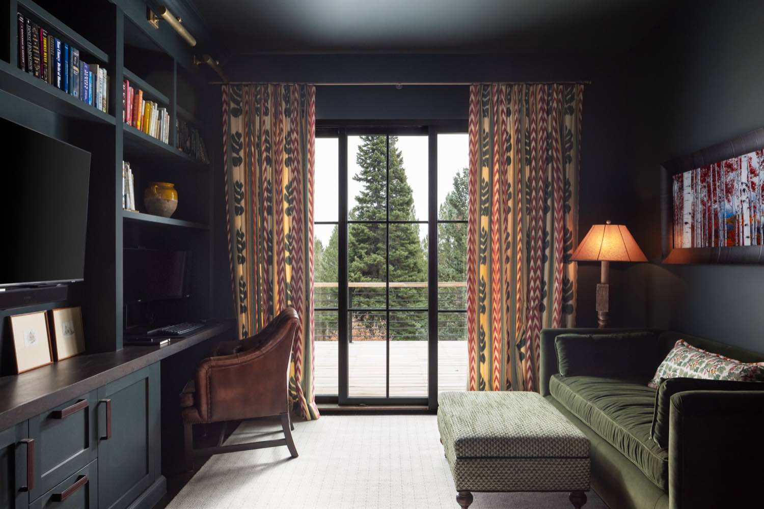 A secondary living space shows the flexibility of the plan. Dark painted built-ins and walls create a more intimate atmosphere, with patterned drapery adding warmth and color. This variation in spatial character from room to room makes the house more interesting to inhabit.
