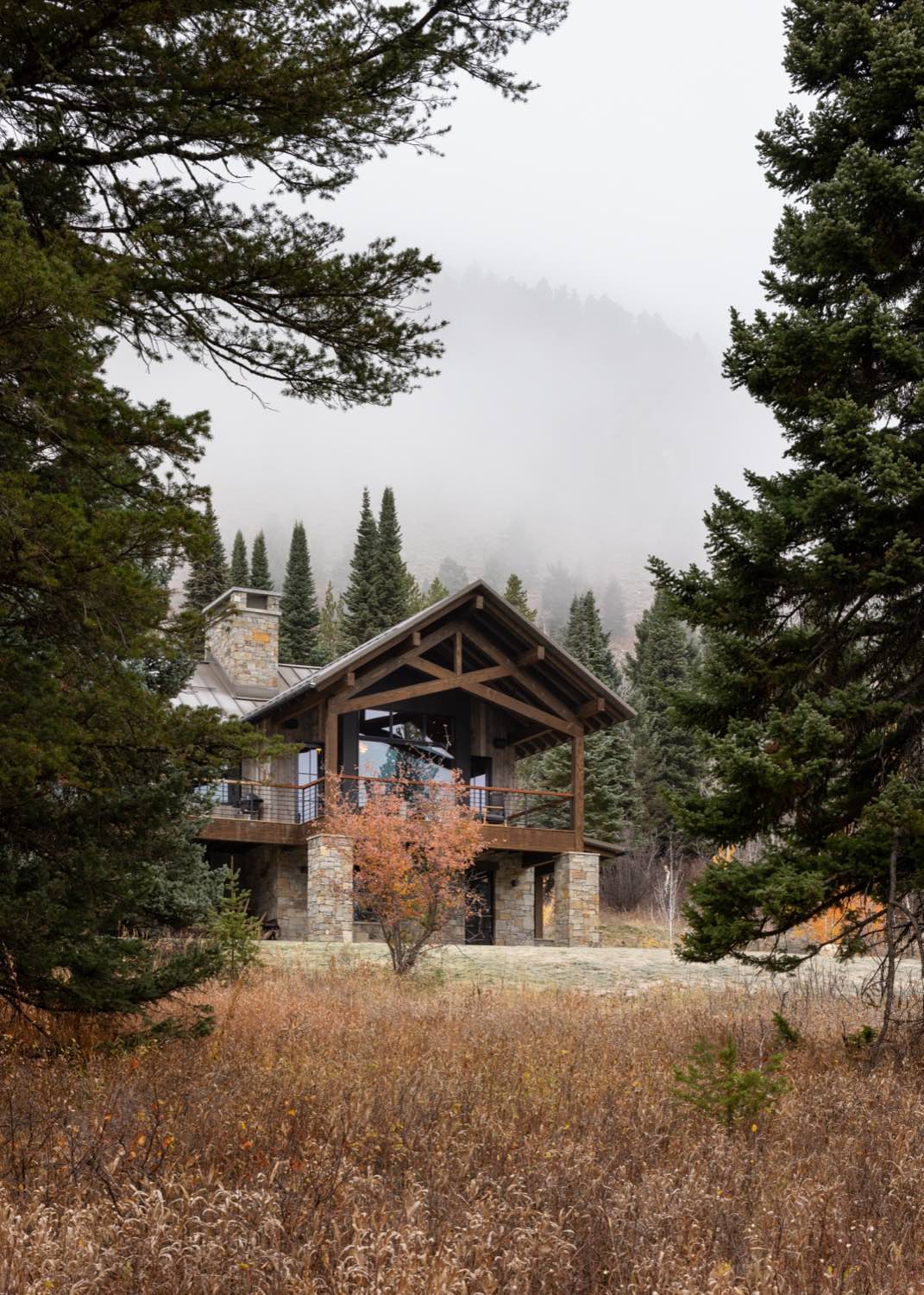 The exterior materials do the heavy lifting here. Vertical weathered timber siding wraps the upper level, showing the grain and character that comes with reclaimed wood. Below, stacked stone piers ground the house to the site and support exposed timber columns that carry the roof overhangs. These aren't decorative posts, they're doing real structural work, and that honesty reads in the architecture.
