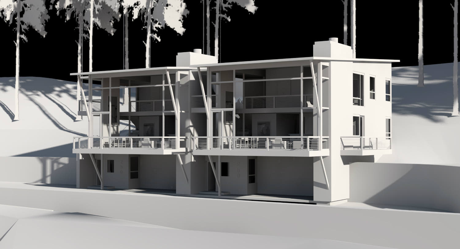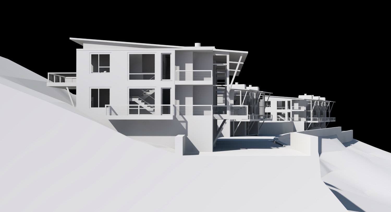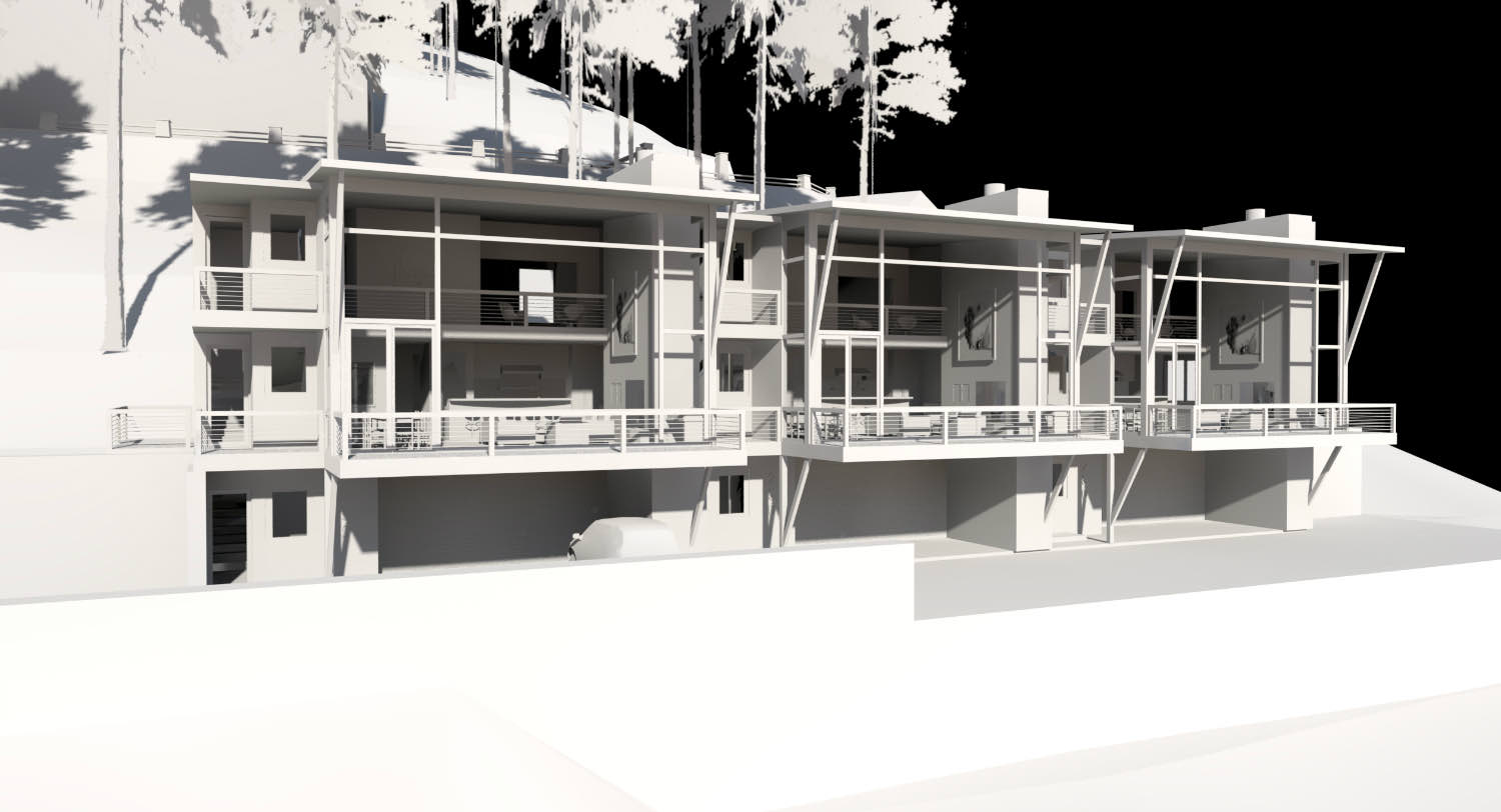 We designed these units to step down the hillside in three-story sections. Each townhome gets its own footprint that keys into the slope at a different elevation. This means you're not cutting massive amounts of earth or building tall retaining walls. The building follows the existing grade, which reduces site work and foundation costs while creating natural separation between units.