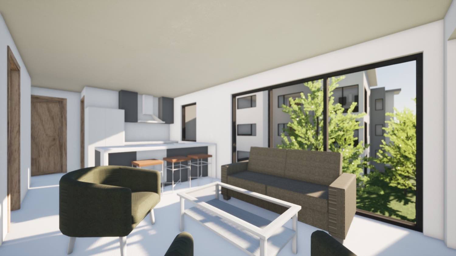 Inside, the units keep the same practical approach. Open living spaces with kitchen islands work for how people actually live today. The floor-to-ceiling windows frame views and make the spaces feel larger than their square footage. Simple finishes that will hold up over time.