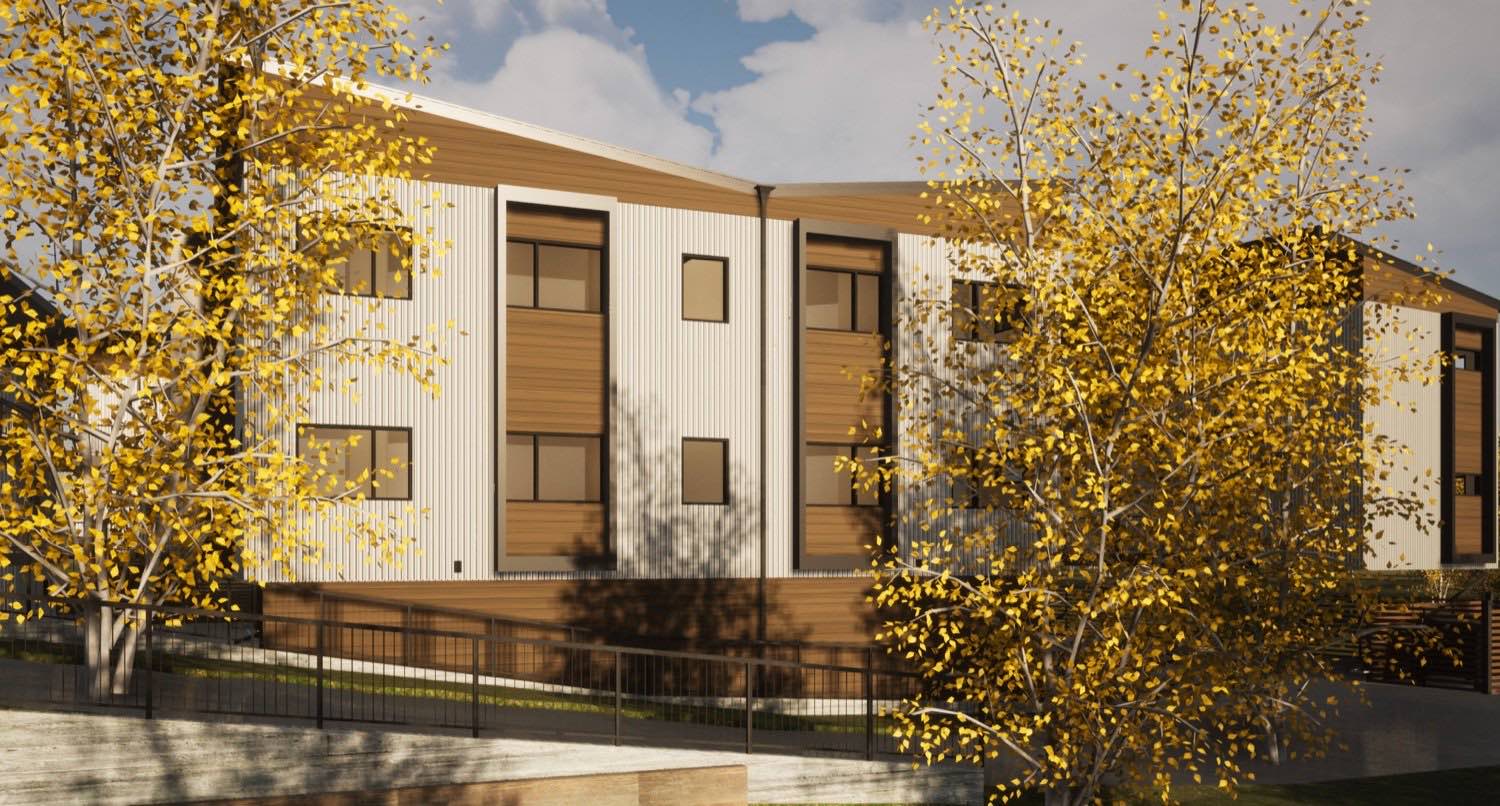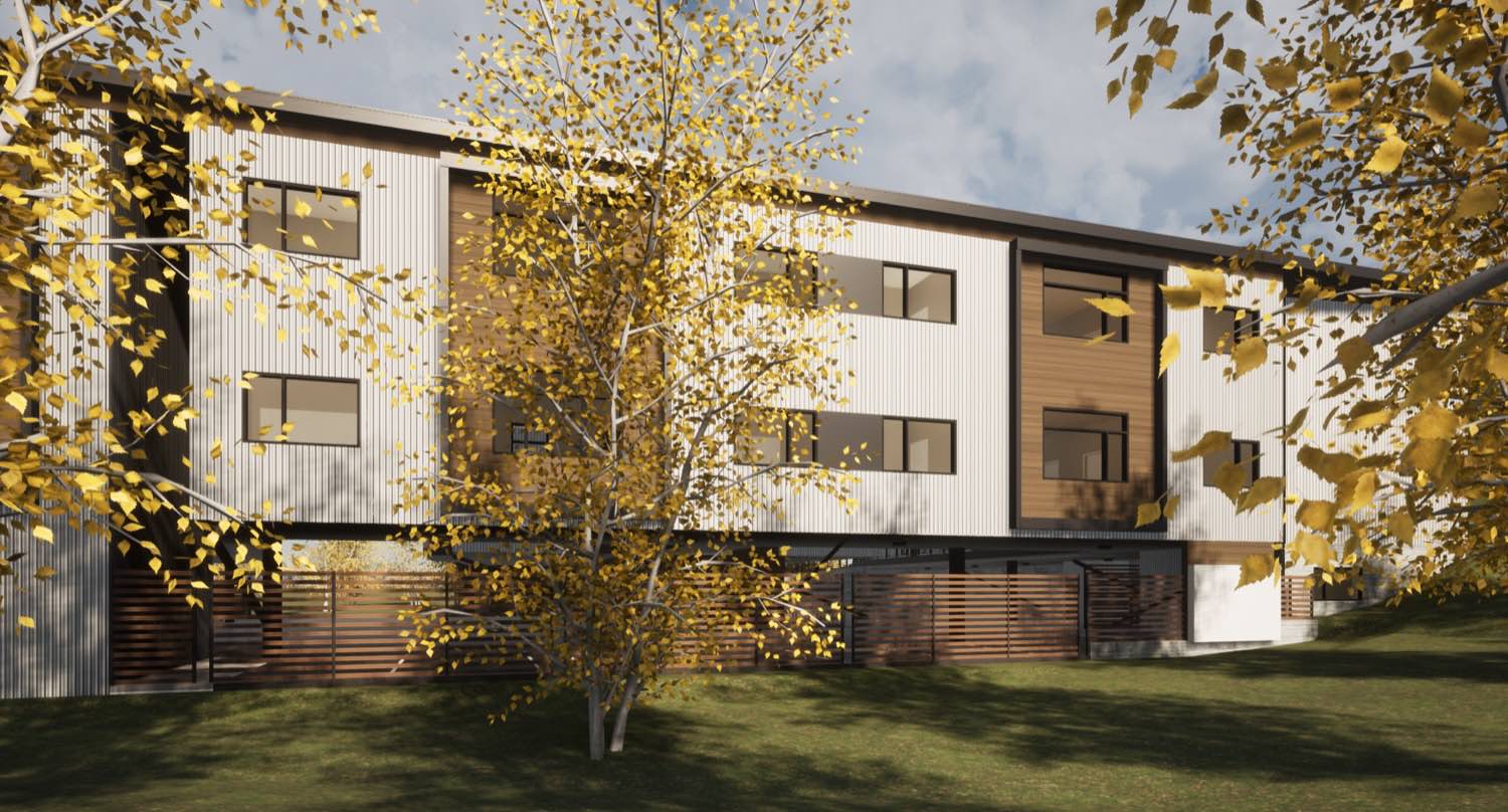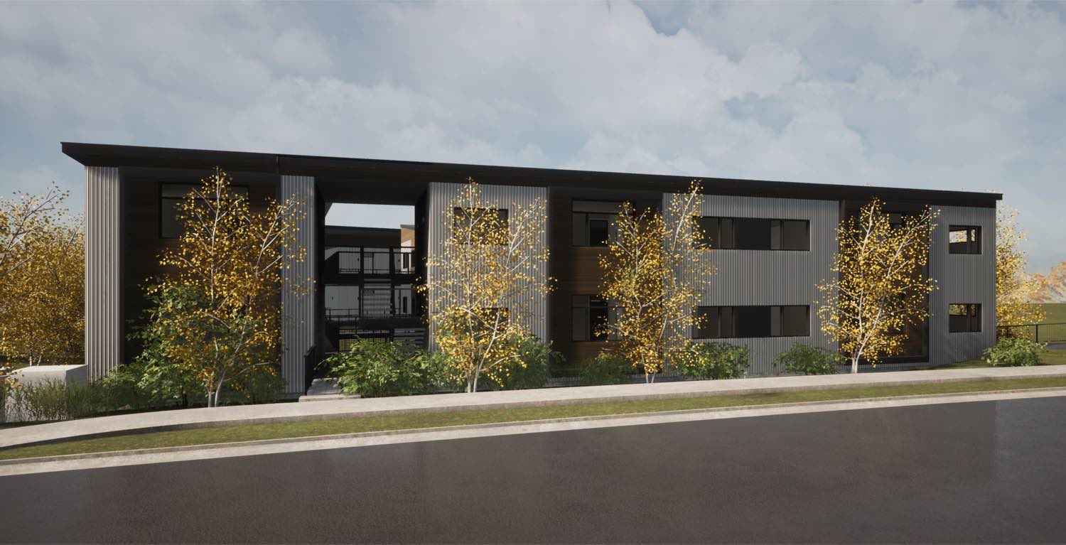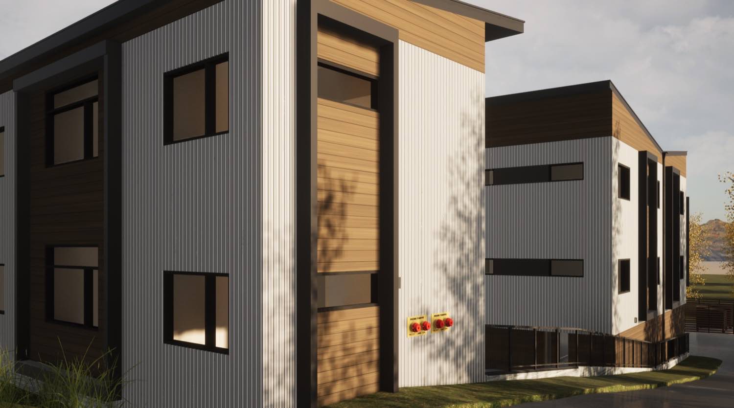 The material strategy is straightforward. Vertical metal siding wraps most of the exterior in charcoal gray and white panels, with cedar running horizontally at key moments to mark entries and unit transitions. The metal gives us clean lines and long-term durability with minimal maintenance. The cedar adds warmth where people interact with the building up close.