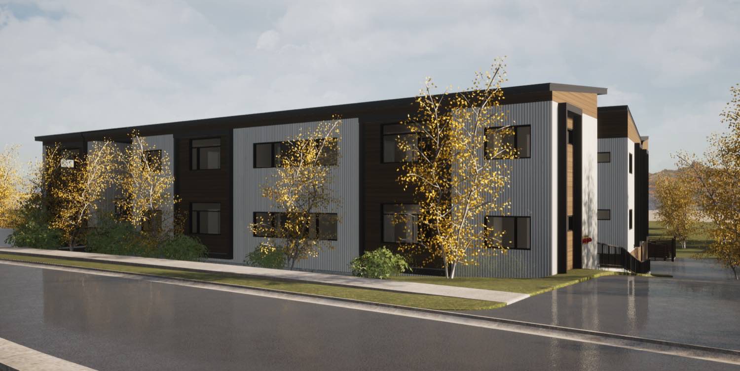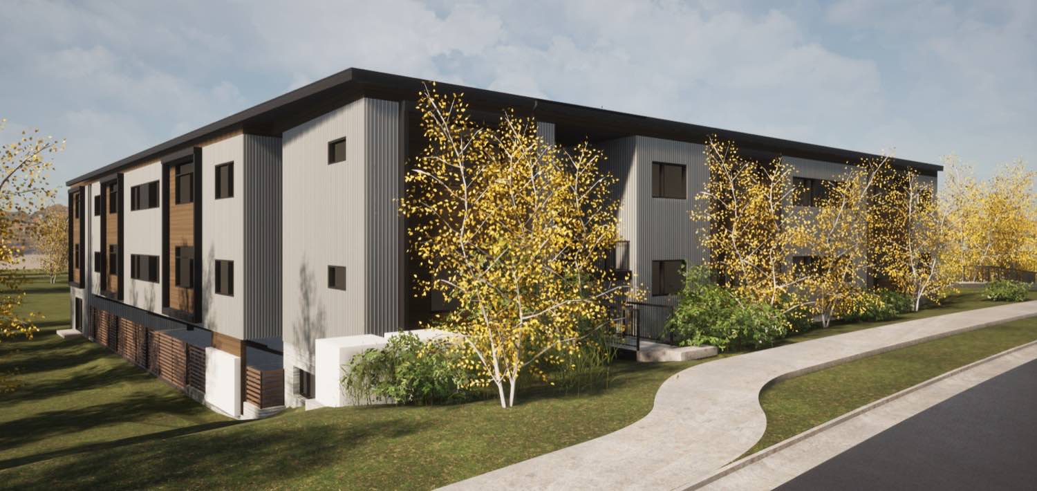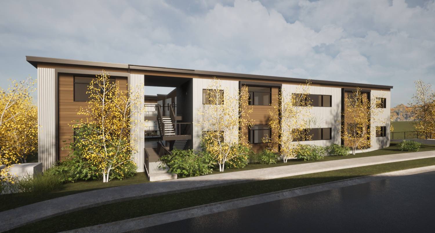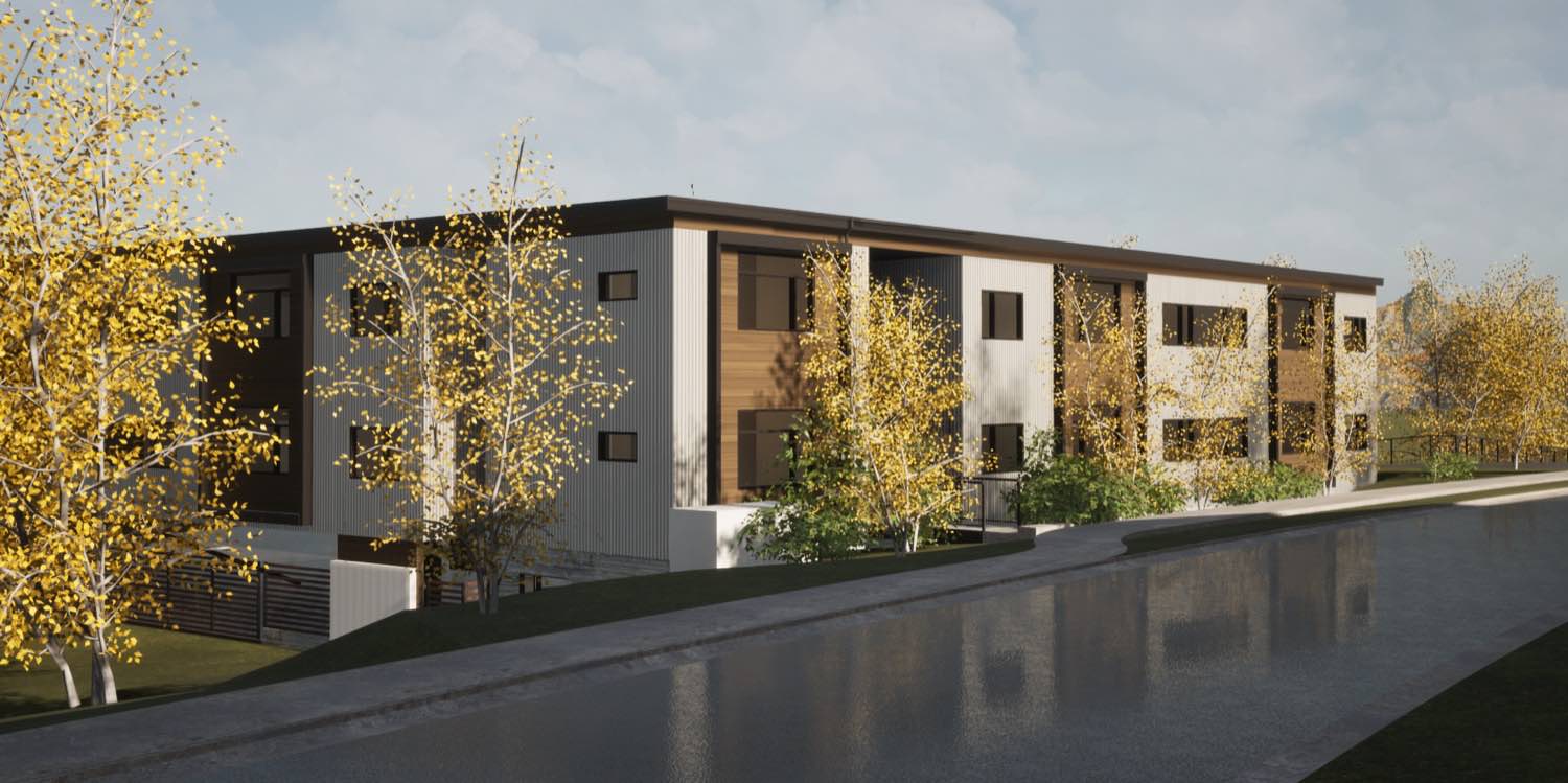 The material strategy is straightforward. Vertical metal siding wraps most of the exterior in charcoal gray and white panels, with cedar running horizontally at key moments to mark entries and unit transitions. The metal gives us clean lines and long-term durability with minimal maintenance. The cedar adds warmth where people interact with the building up close.