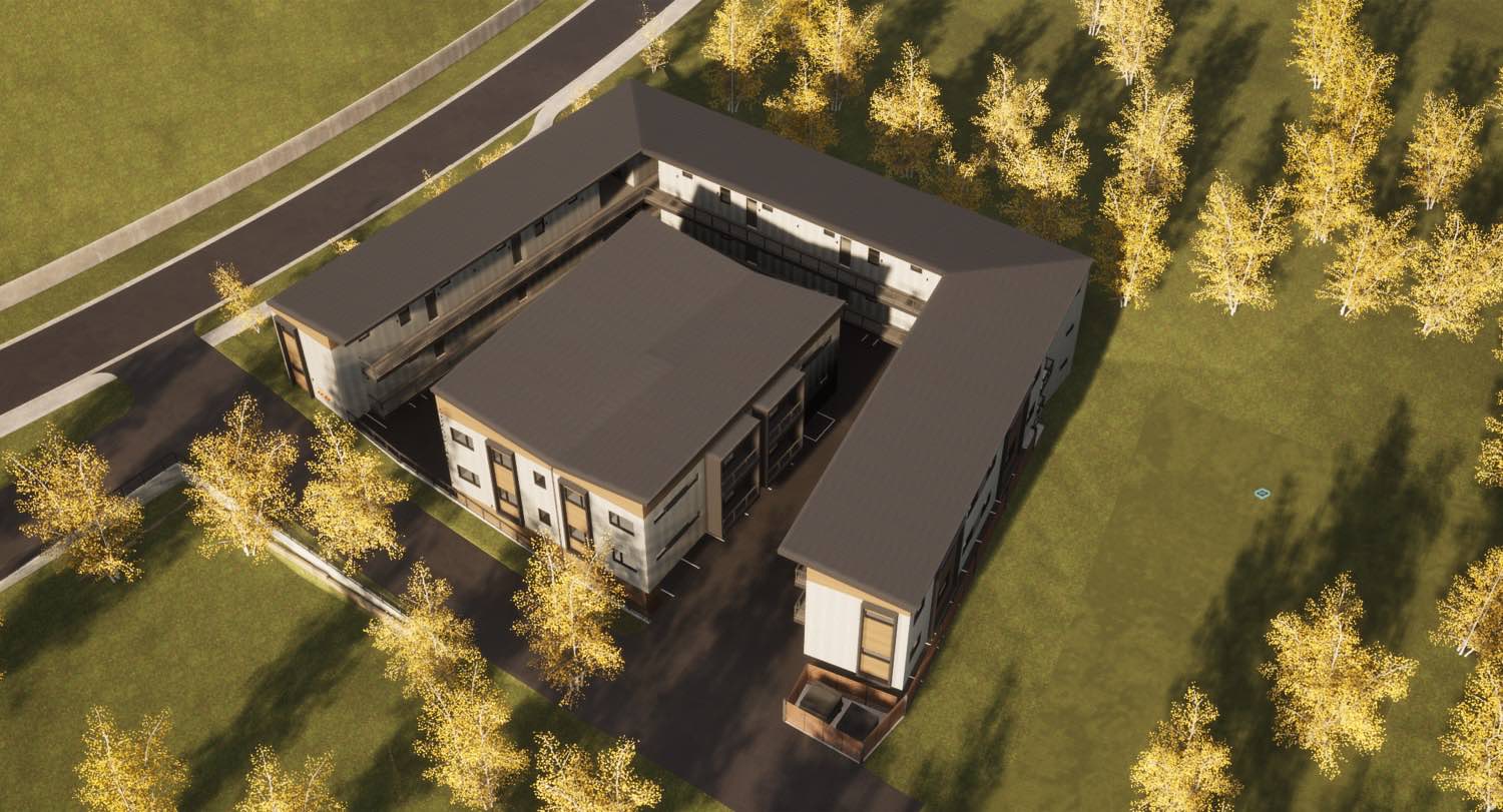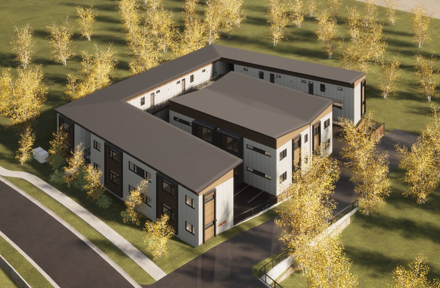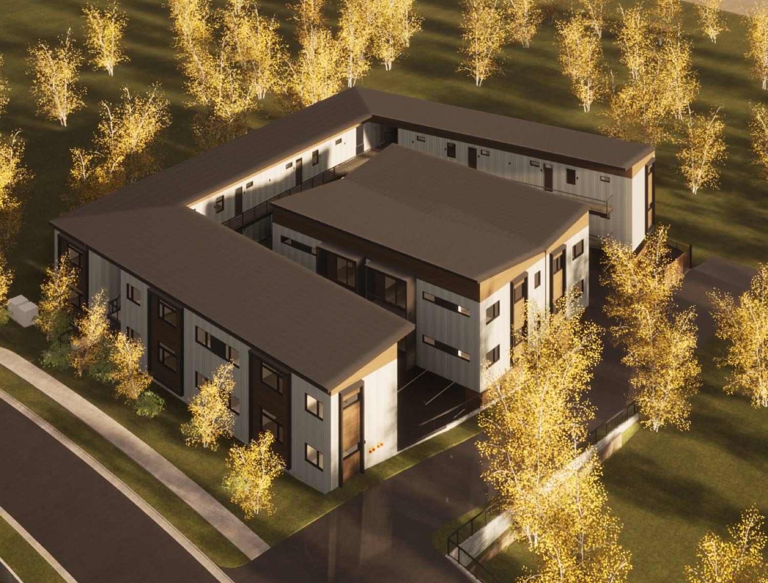 The courtyard configuration does a few things well. It provides shared green space for residents without requiring a large lot. The three wings define outdoor areas that feel more private than a typical apartment complex. And the open fourth side preserves views to the surrounding landscape while allowing natural ventilation through the site.