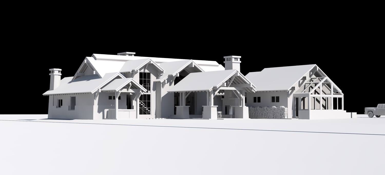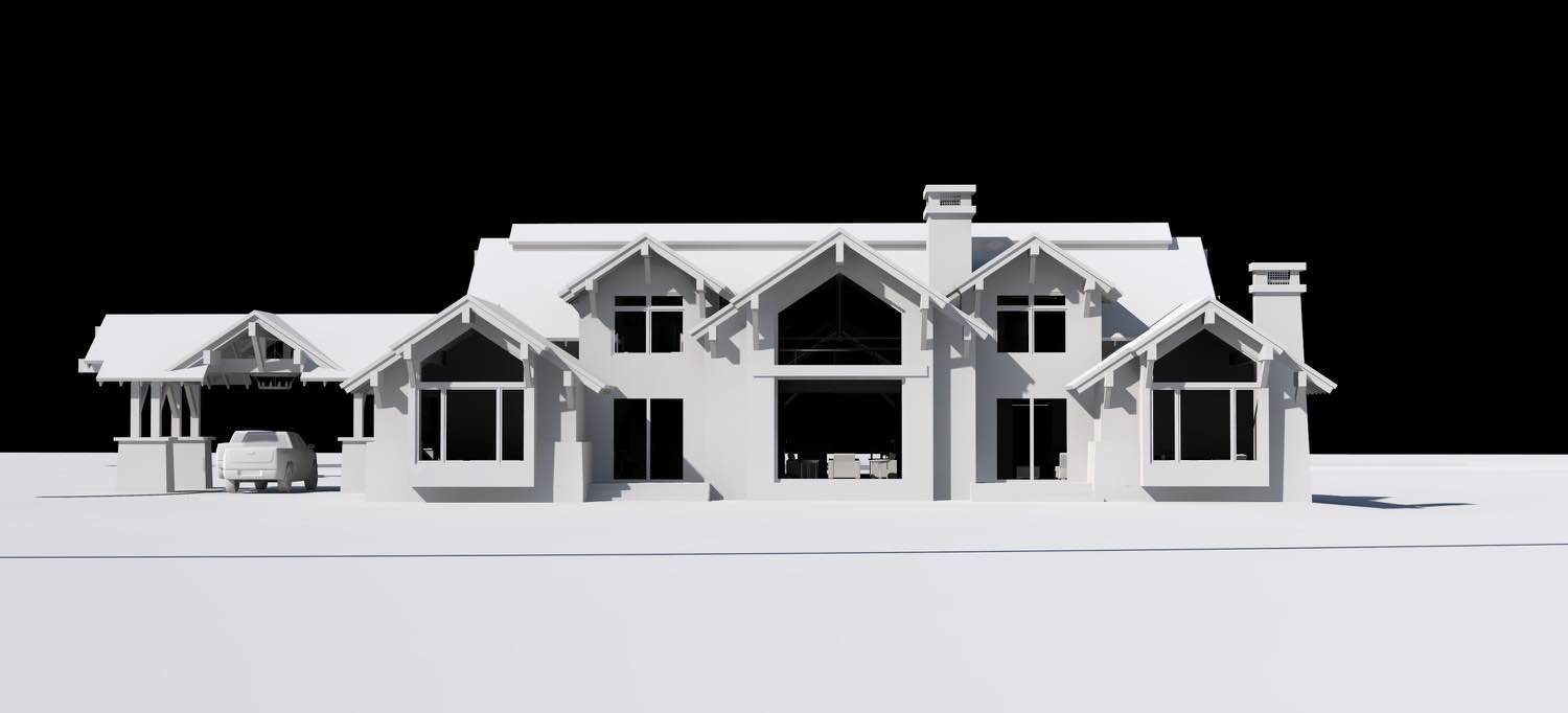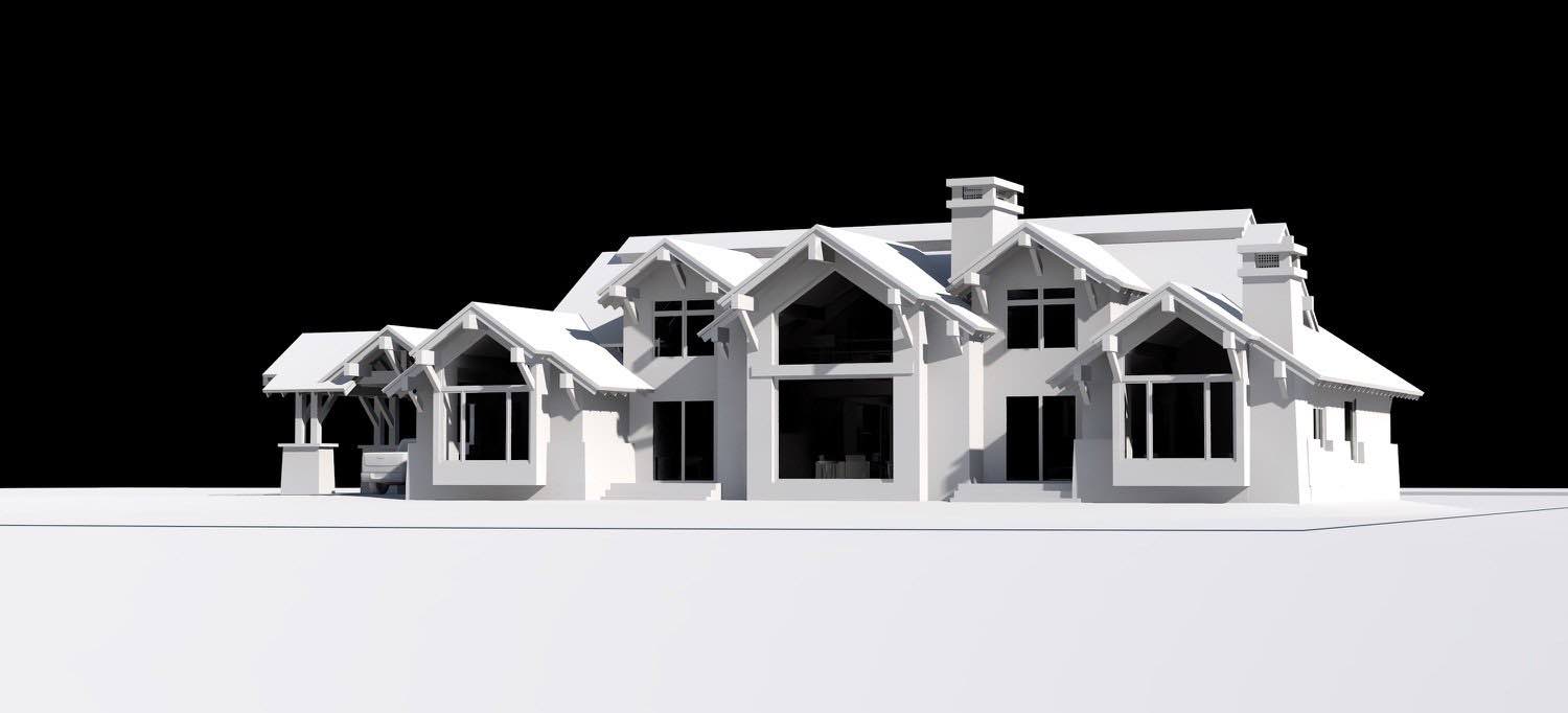 The timber framing is structural, not decorative. We're using it to support the gable ends and create covered outdoor spaces where the roof extends beyond the wall line. Those exposed beams and brackets give the house a mountain vernacular without being heavy-handed about it. The framing expresses how the building is put together.