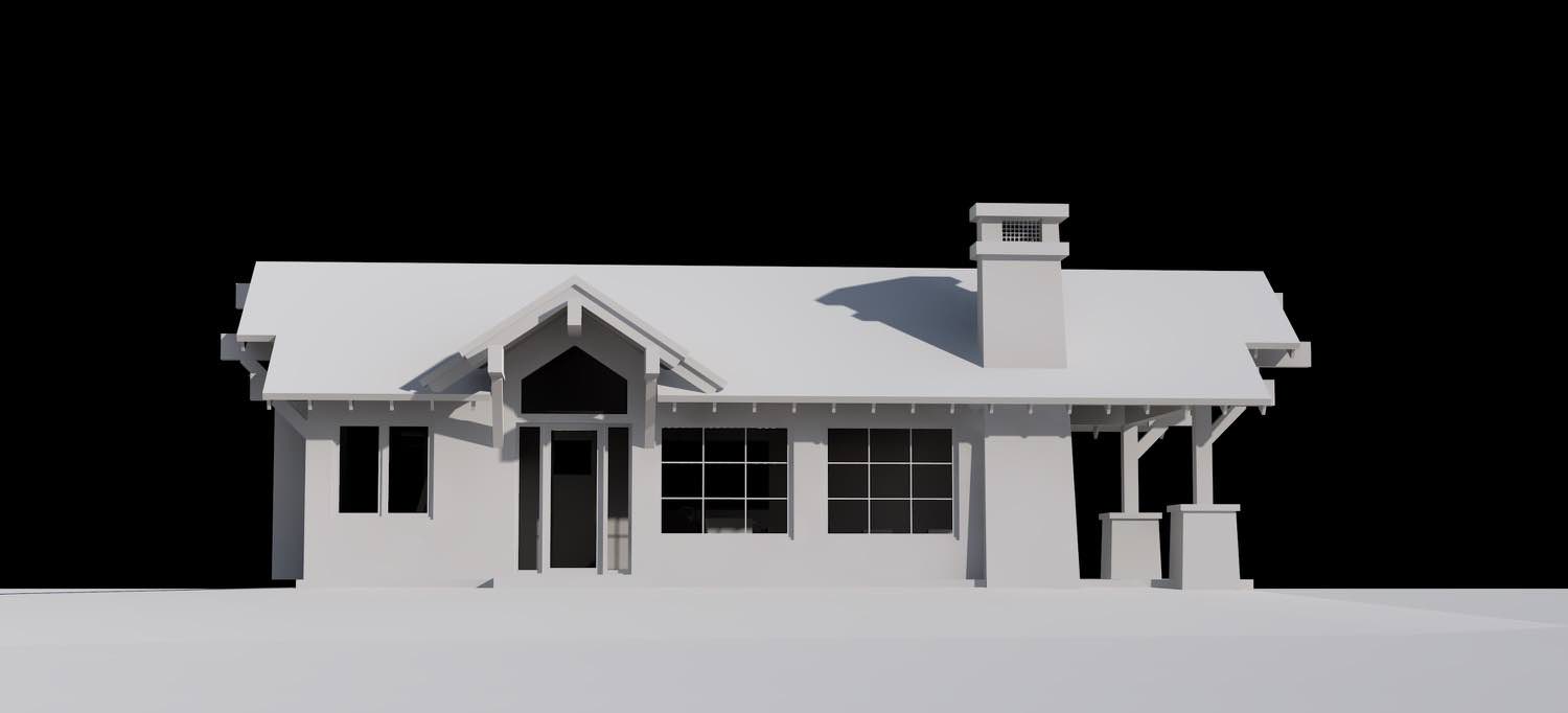 Material choices are straightforward. Stucco walls painted in a light color, natural timber framing left exposed, and what appears to be stone or cultured stone at the base and chimney masses. The windows are sized and placed to capture views while maintaining wall strength where we need it. The large openings occur where interior spaces demand light and connection to the outdoors.