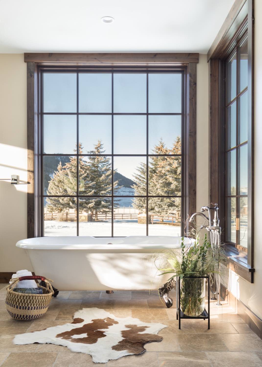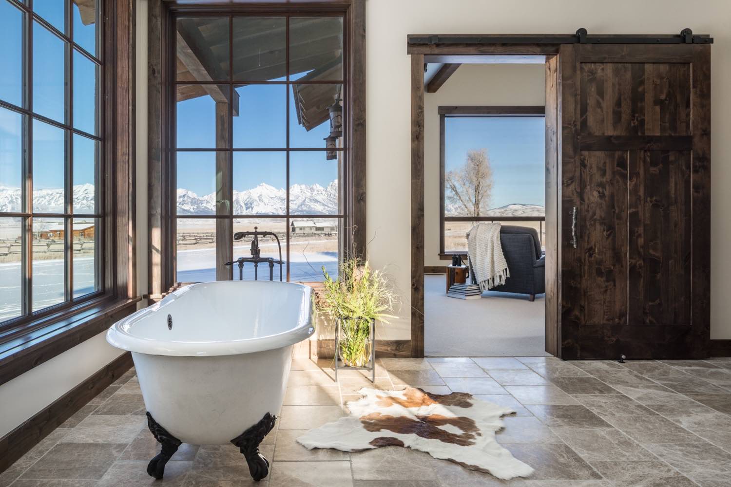 The bathrooms use freestanding tubs positioned at windows overlooking the ranch. Stone tile surrounds the showers, with the same material extending to the floor. Sliding barn doors and heavy timber casings maintain the rustic detailing seen elsewhere in the house.