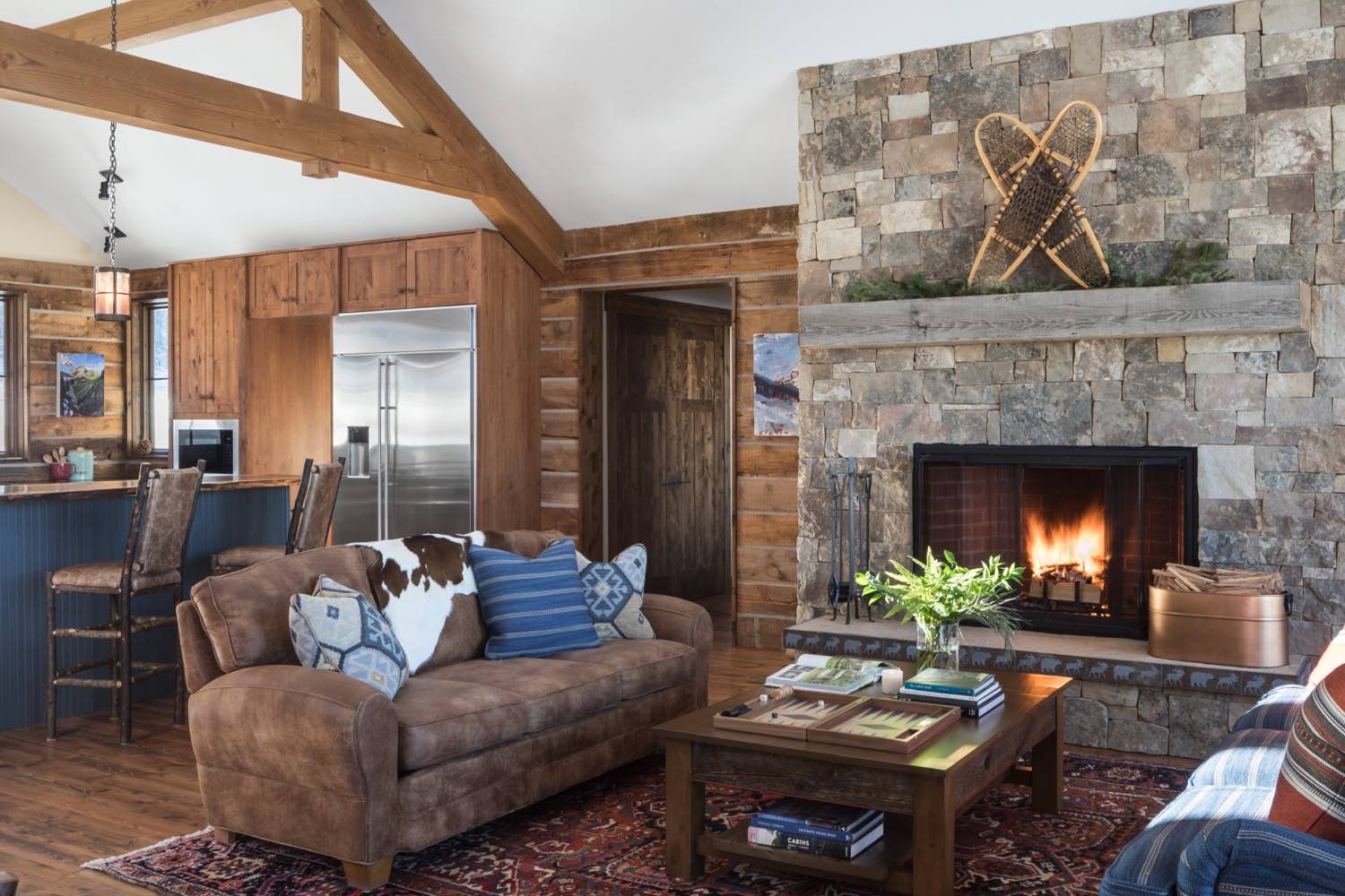 A stone fireplace anchors the living area, with stacked stone extending floor to ceiling. The material provides mass and texture against the lighter log walls. Large windows frame views across the snowy fields to the mountains beyond, connecting the interior spaces directly to the landscape.