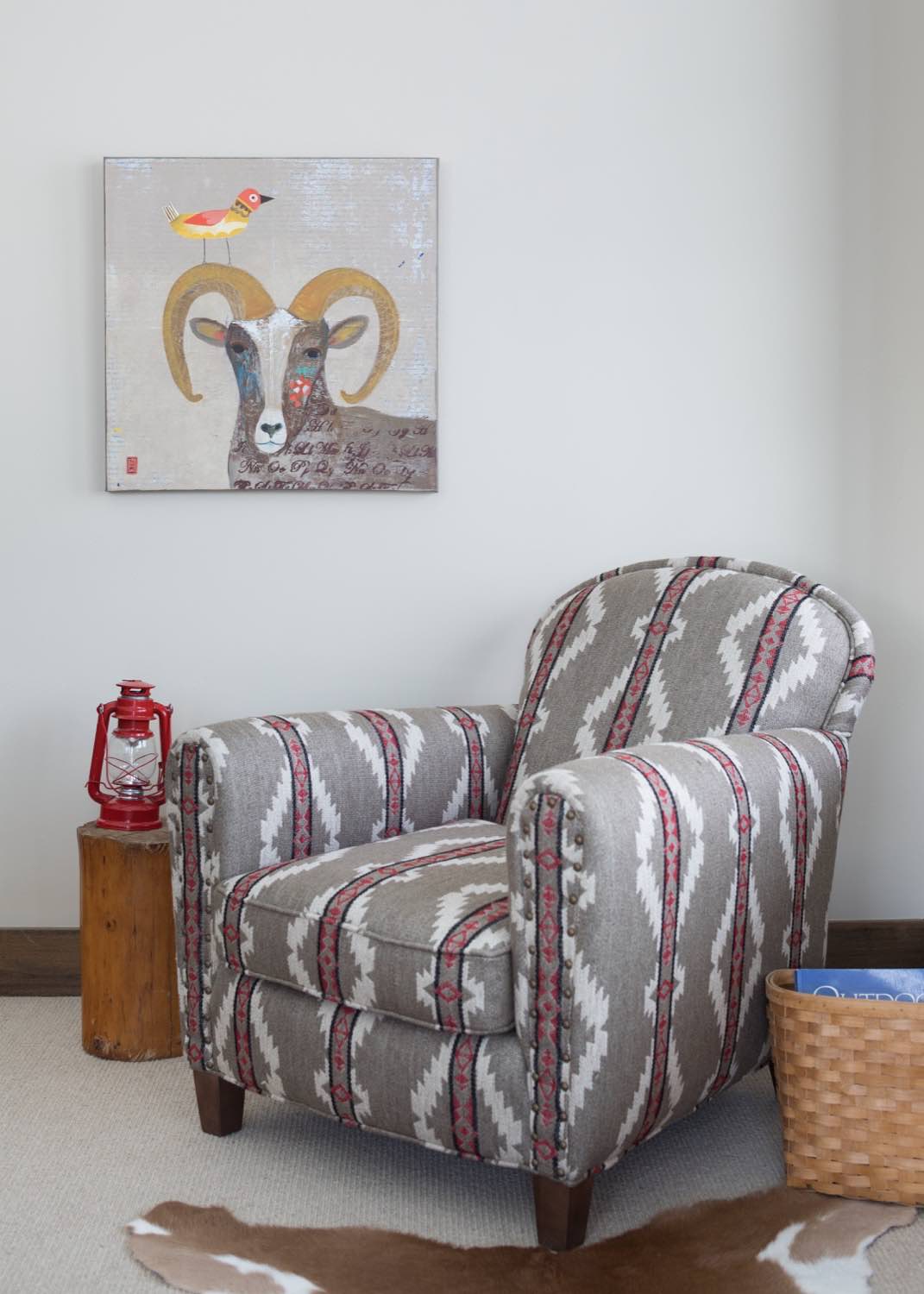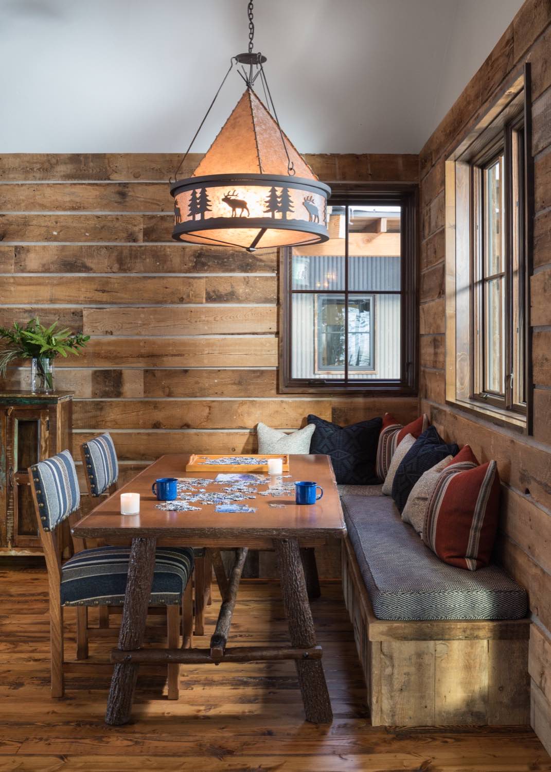 We designed a smaller breakfast nook with built-in seating wrapped around a rustic table. A pendant with silhouetted wildlife motifs hangs above the space. The scale feels intimate compared to the main living volume, giving the family a choice in how they want to gather.