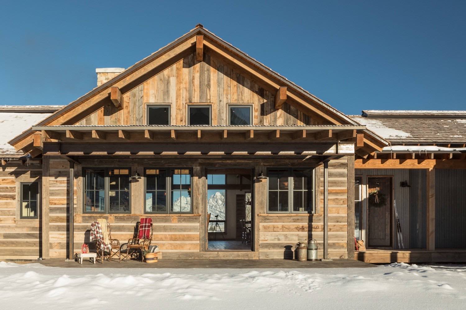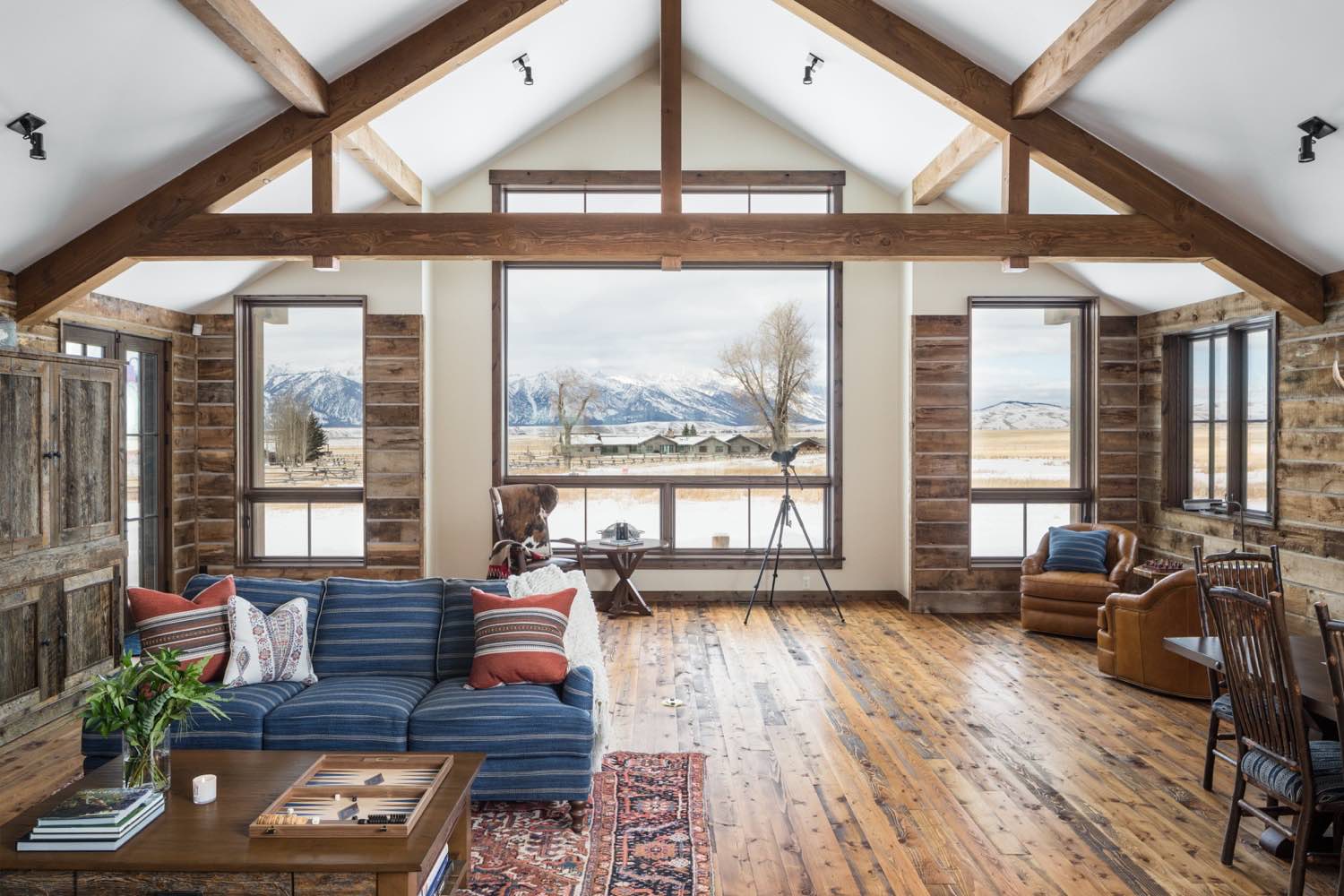 A secondary living space with vaulted ceilings and exposed trusses gives the home additional gathering area. The timber structure frames a large window wall that captures the Teton views. Reclaimed wood flooring with visible character and color variation runs throughout.