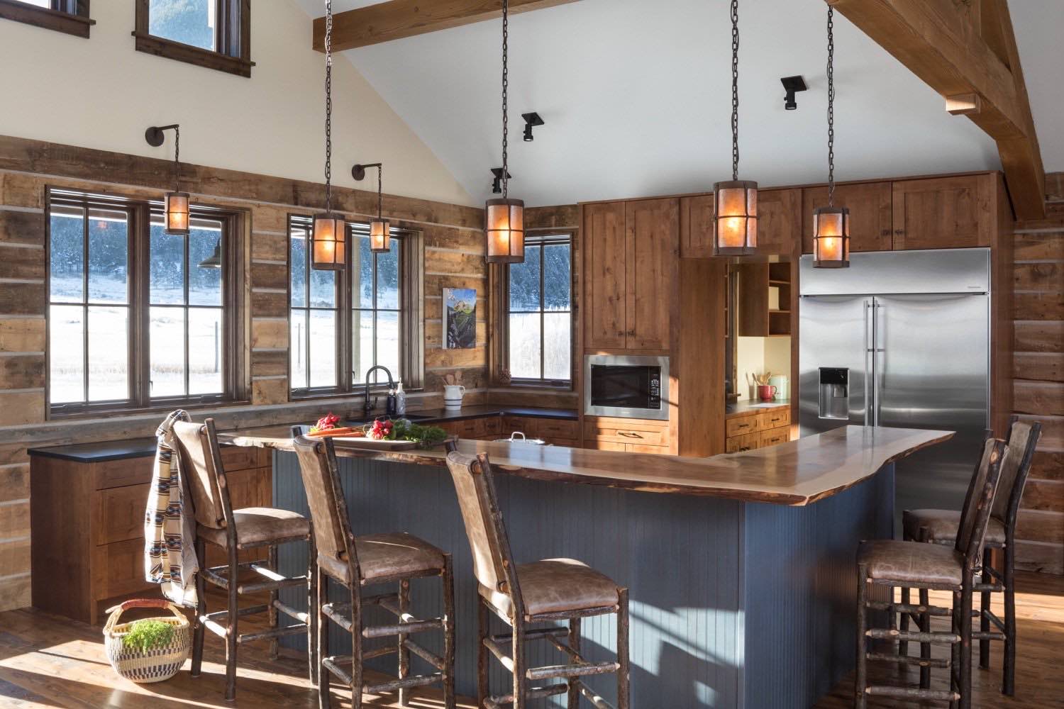 The kitchen island has a live edge wood countertop and corrugated metal cladding that echoes the exterior siding. Pendant lights hang on chains from the timber structure above. Dark gray counters on the perimeter cabinets balance the warmth of the wood throughout the space.