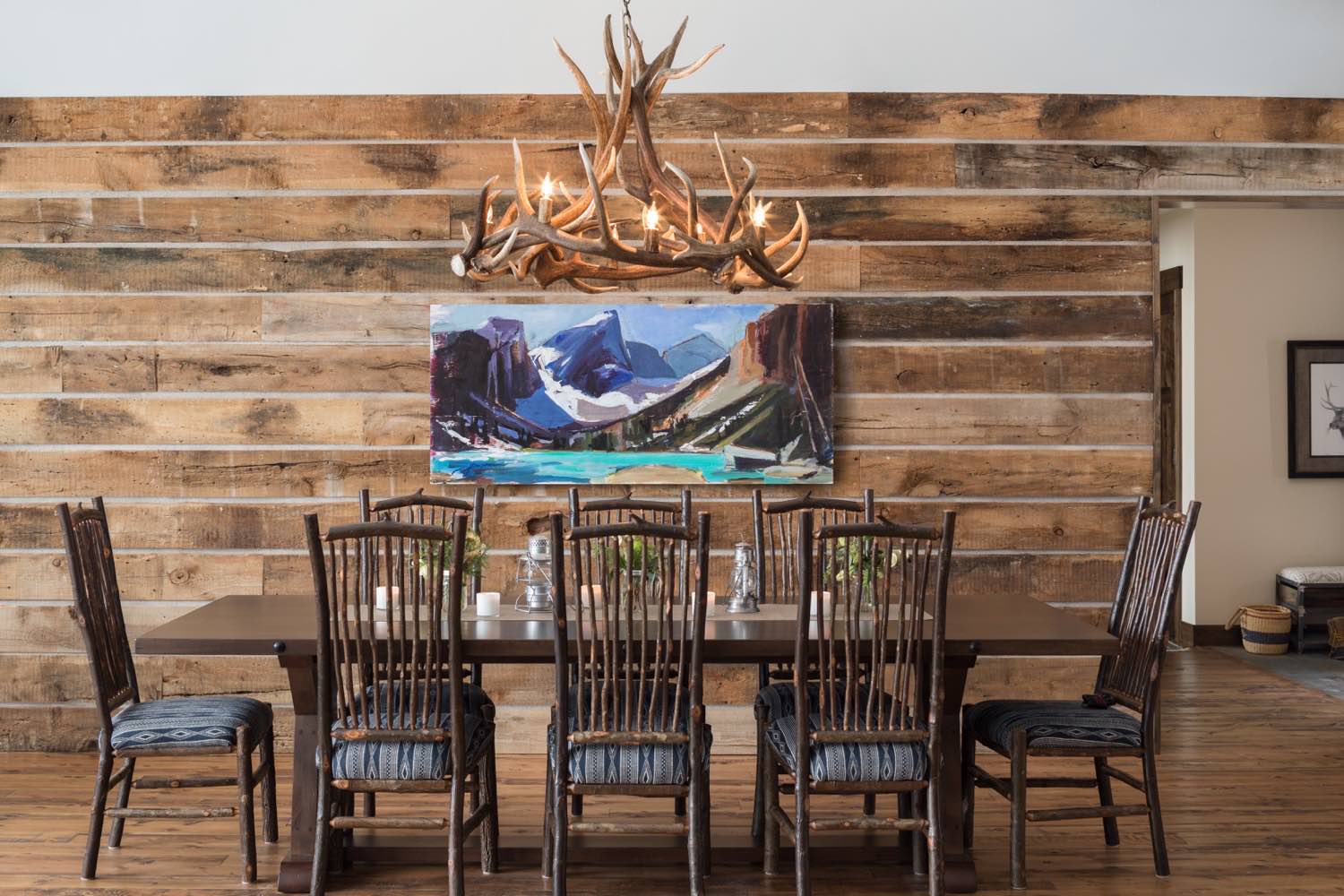The home flows naturally from public to private spaces. A dining area sits between kitchen and living zones, with a reclaimed wood feature wall and an antler chandelier marking the transition. The timber framing remains visible throughout, organizing the open plan without closing it off.