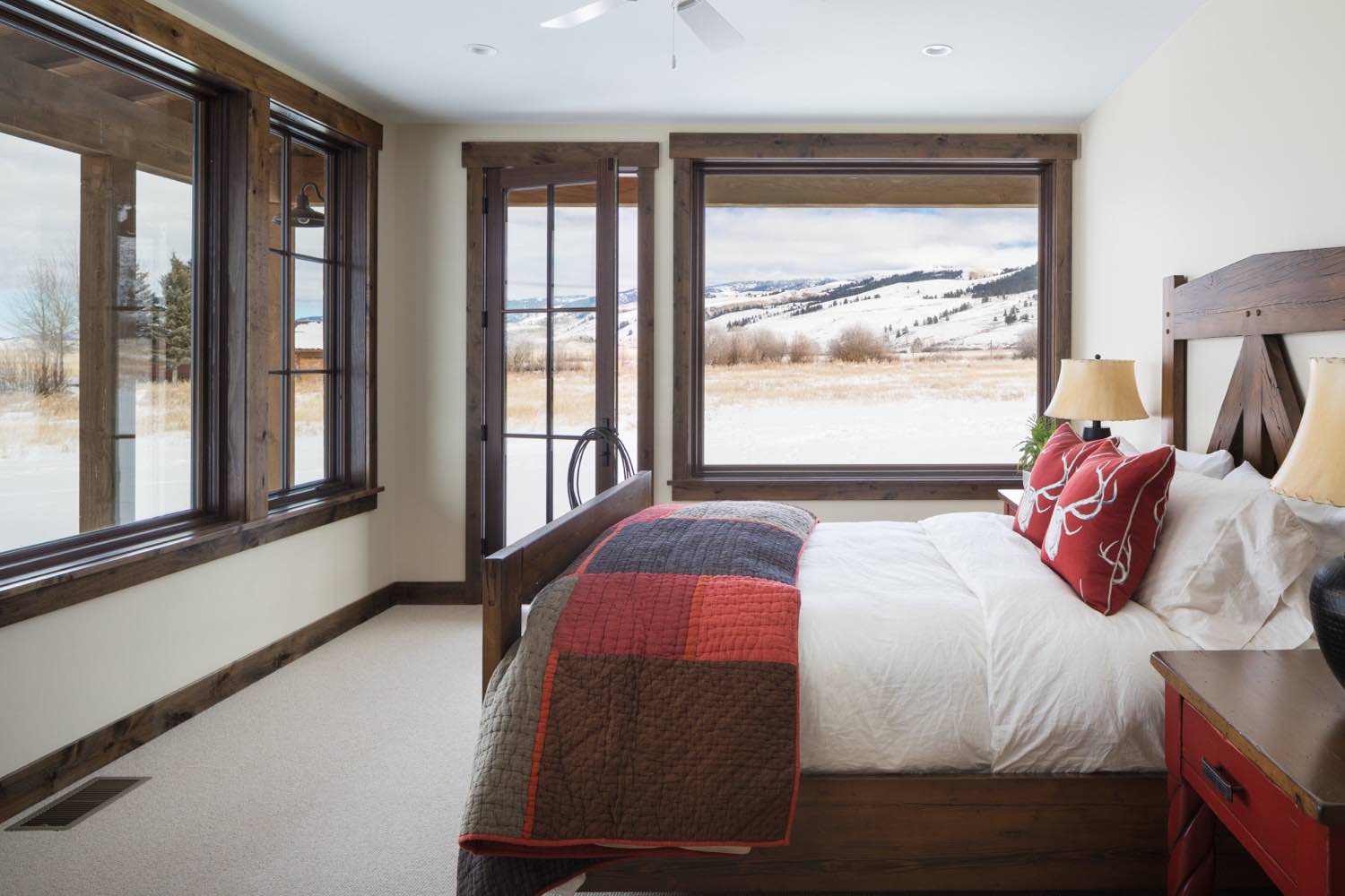 Guest spaces maintain the same material palette but offer quieter views and lower ceilings. Bedrooms have large windows positioned to frame specific landscape features. The wood trim and baseboards are stained dark to ground the lighter wall finishes.
