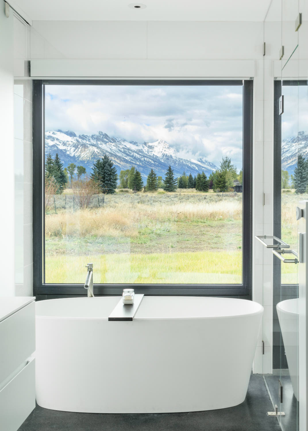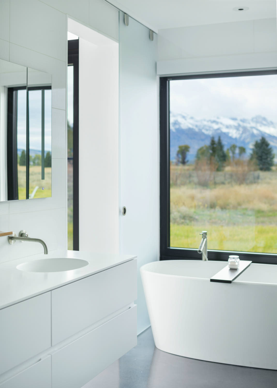 The bathrooms use large-format white tile and minimal detailing. One bathroom places a freestanding tub directly in front of a large picture window with mountain views. Another uses a corner tub with windows on two sides. The fixtures are modern and simple, the floors are polished concrete, and the overall effect is clean without being cold.