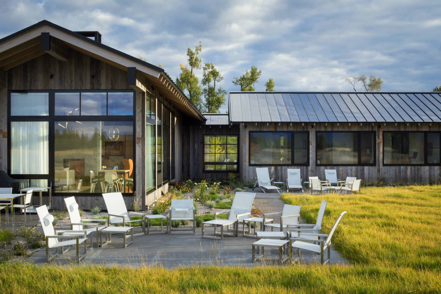 The house addresses the meadow with multiple outdoor spaces. Gravel paths with native plantings connect different seating areas. Some are paved, others just grade into the grass. White lounge chairs and conversation groupings sit directly on the meadow, taking advantage of the views in all directions.