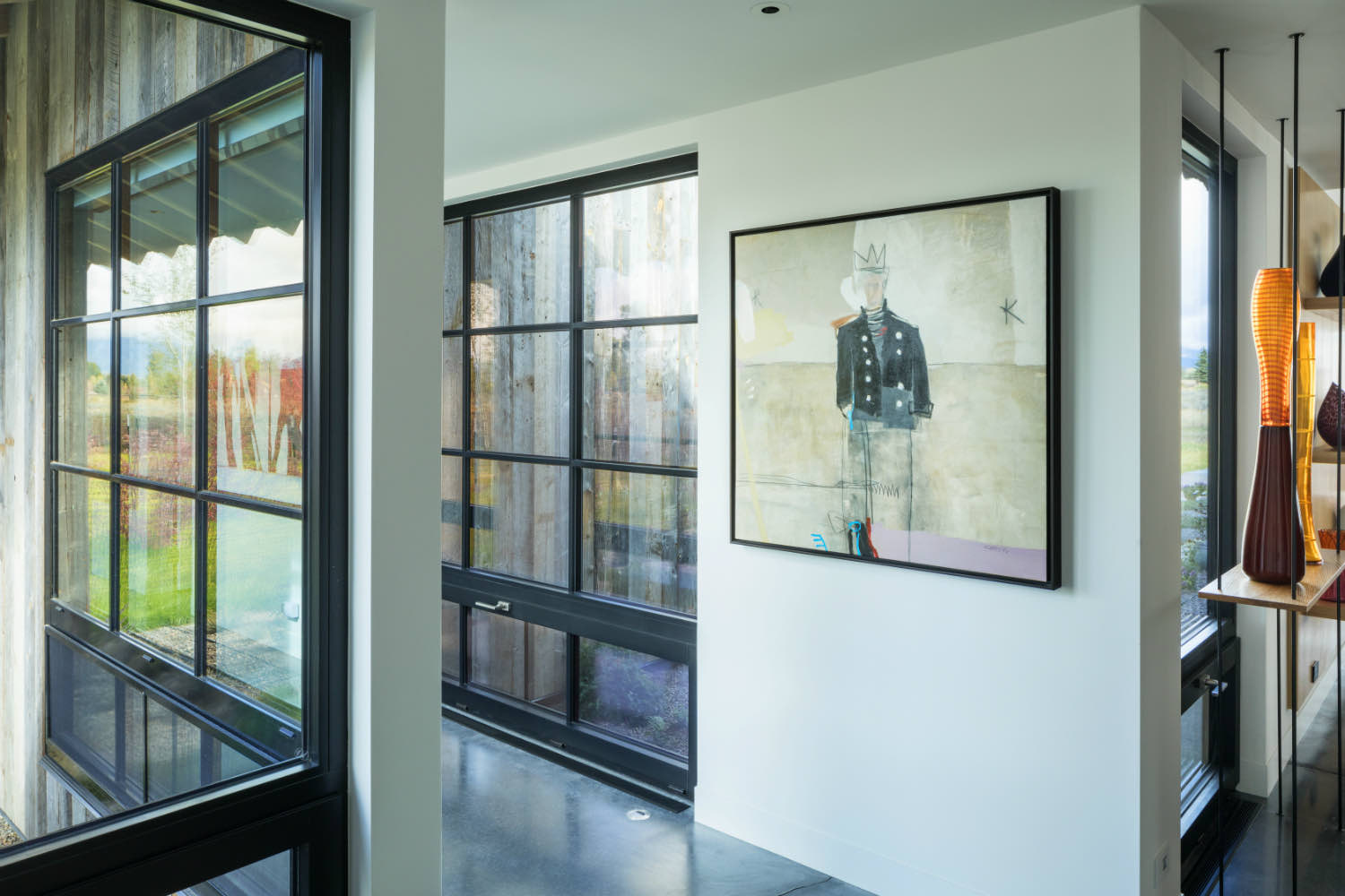 A long corridor connects the main living spaces to the bedroom wings. We kept it simple with white walls, polished concrete floors, and clerestory windows that bring in daylight from above. The windows are floor-to-ceiling on one side, framed in black steel, providing views directly out to the meadow and mountains.