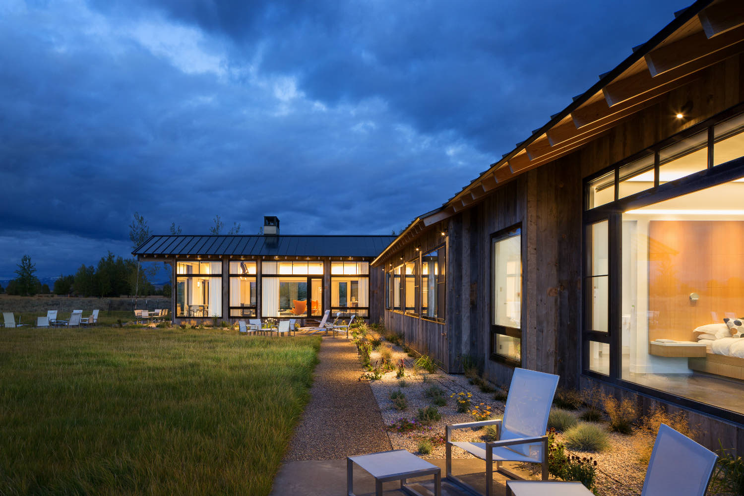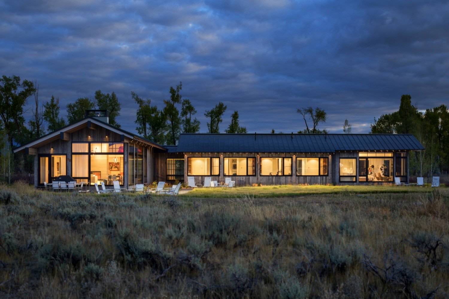 At dusk the house glows from within, the dark frames and weathered siding falling back while the interior spaces and their warm lighting become visible across the meadow. The metal roofs reflect the last light, and the house reads as a series of connected pavilions rather than a single large mass.