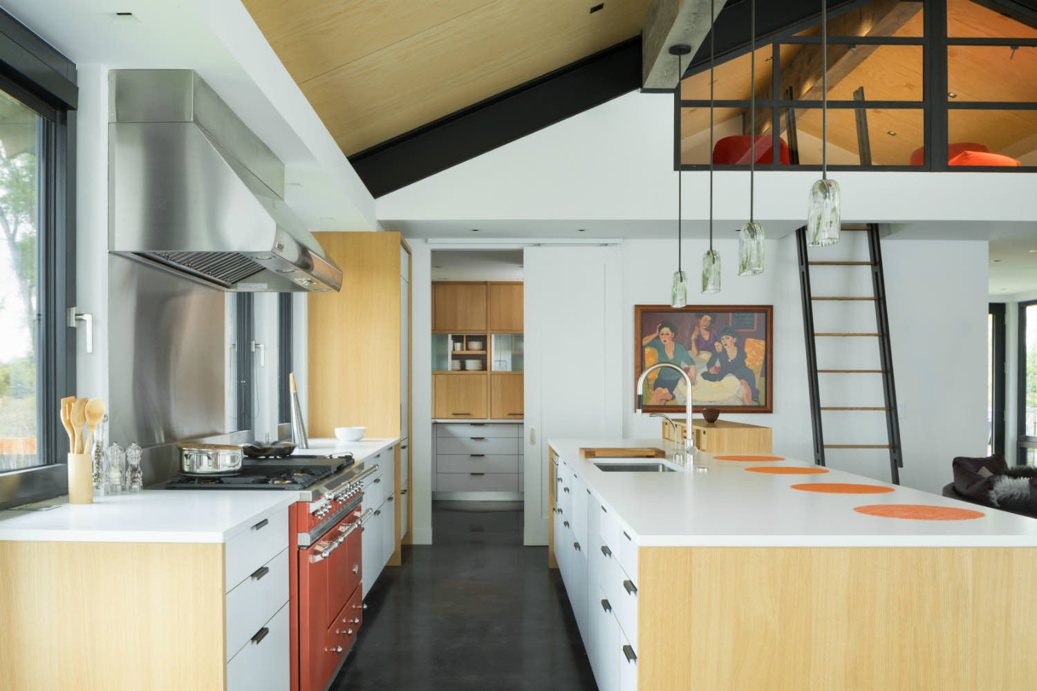 A sleeping loft sits above the kitchen, accessed by a simple steel ladder. The loft overlooks the main space through a glazed opening with black steel frames, creating vertical layering in what would otherwise be a single-story volume. Glass pendant lights hang from the tall ceiling on long cords to bring the lighting down to a more human scale.