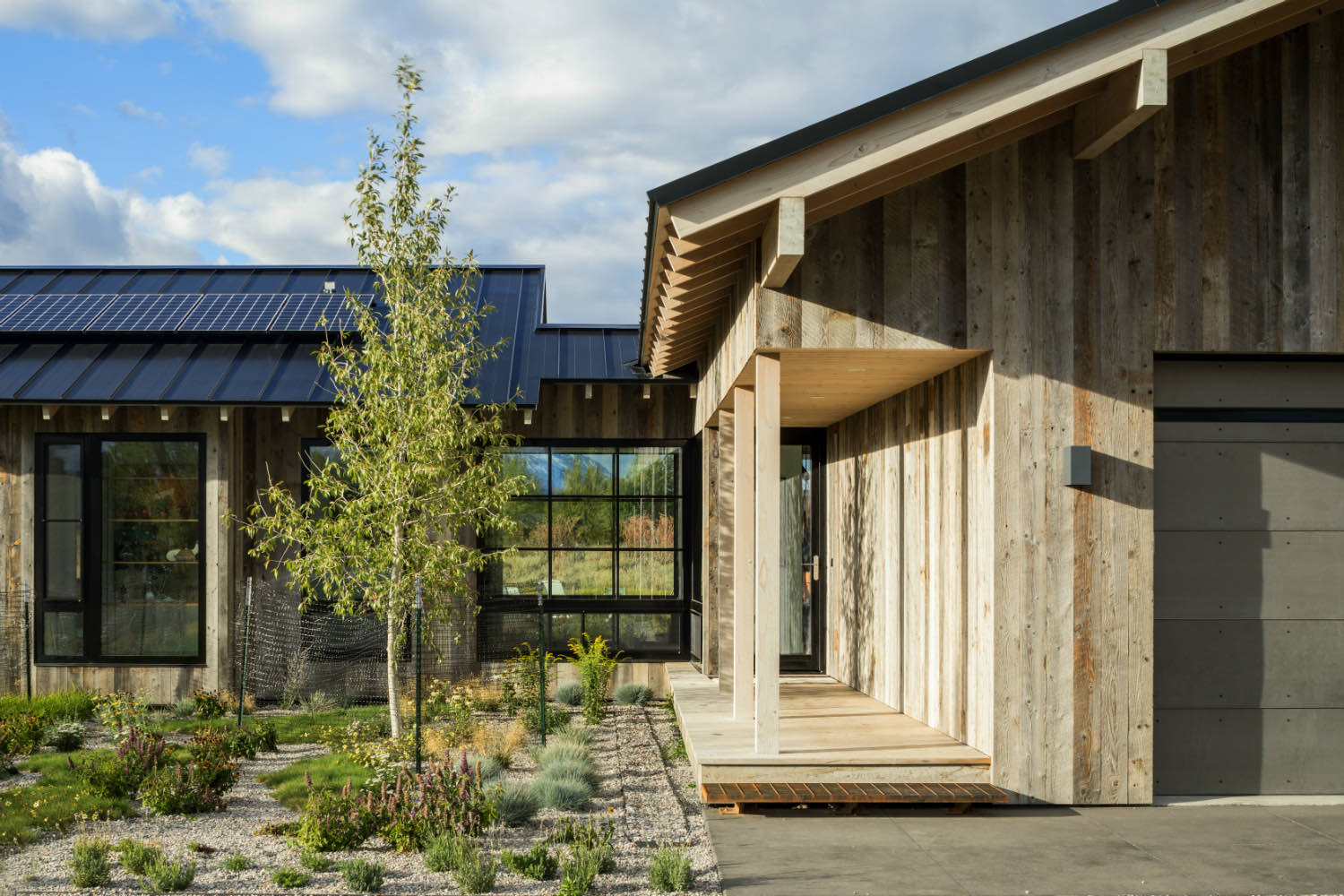 The entry sequence uses weathered wood siding in vertical orientation, mixing lighter and darker tones within the same plane. Deep overhangs shelter the doors and create transition spaces between inside and out. The landscaping is intentionally sparse, keeping the focus on the natural meadow rather than trying to compete with it.