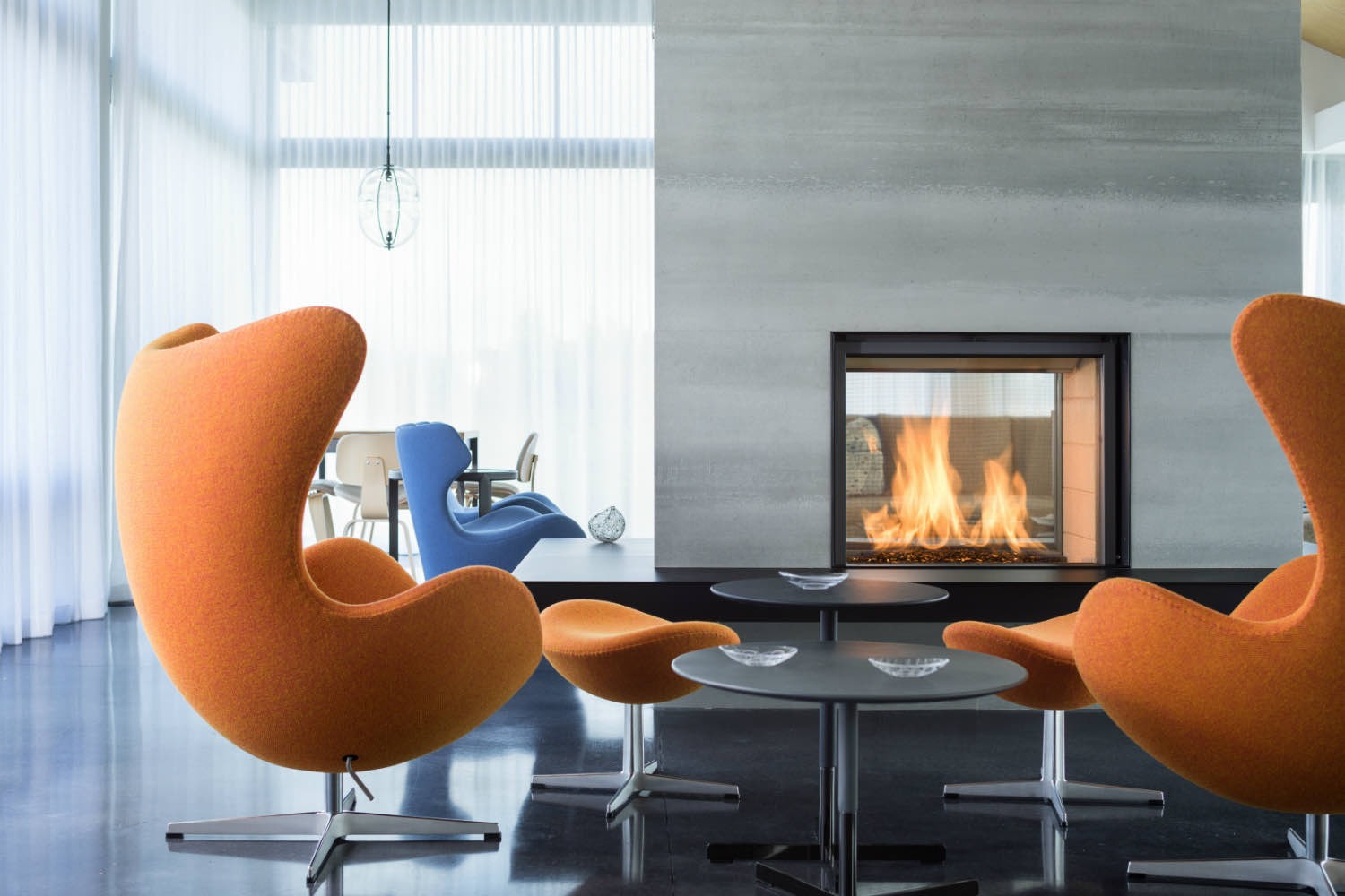 The fireplace becomes the focal point from multiple rooms. We detailed it as a see-through unit with a raised black platform so it floats slightly above the floor. The board-formed concrete reads as a single monolithic element punching through the space, with horizontal striation from the forming boards still visible in the surface.