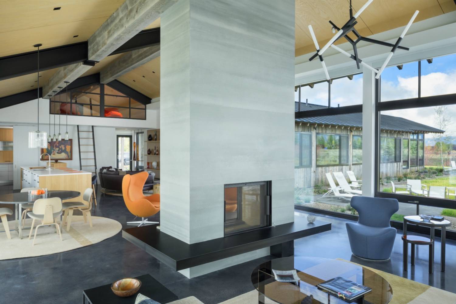 The main living space is organized around a large board-formed concrete chimney that divides the kitchen from the living areas. This structural element anchors the open plan and provides a double-sided fireplace that works from both sides. The ceiling steps up to accommodate the gable, with light wood planking on the underside and exposed black steel beams defining the ridge and structure. We kept the palette simple with polished concrete floors, light wood cabinetry, and white countertops.