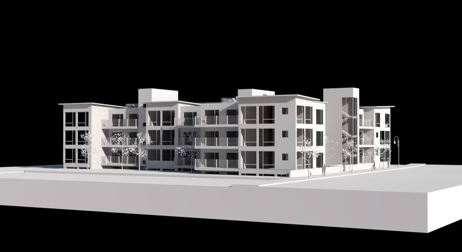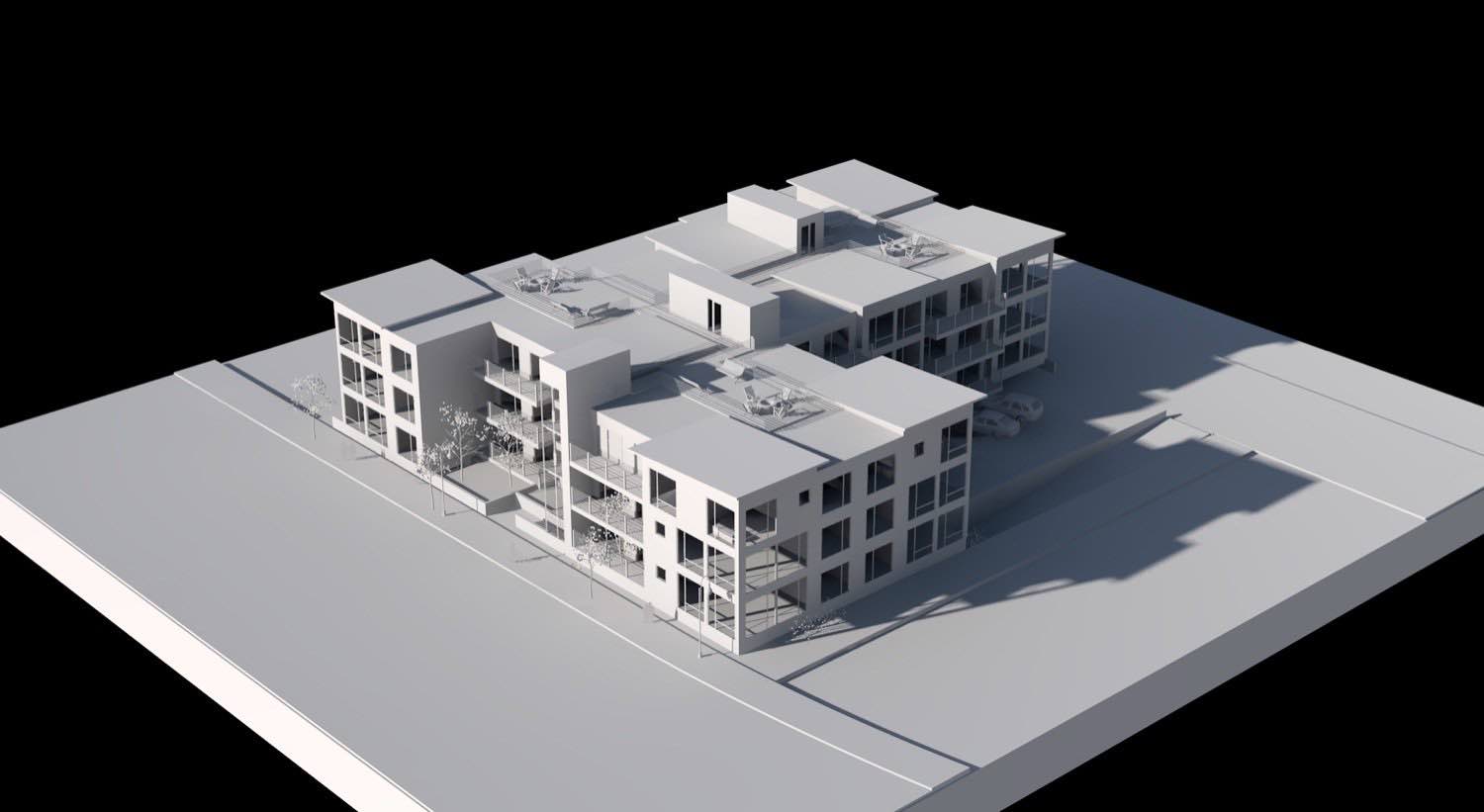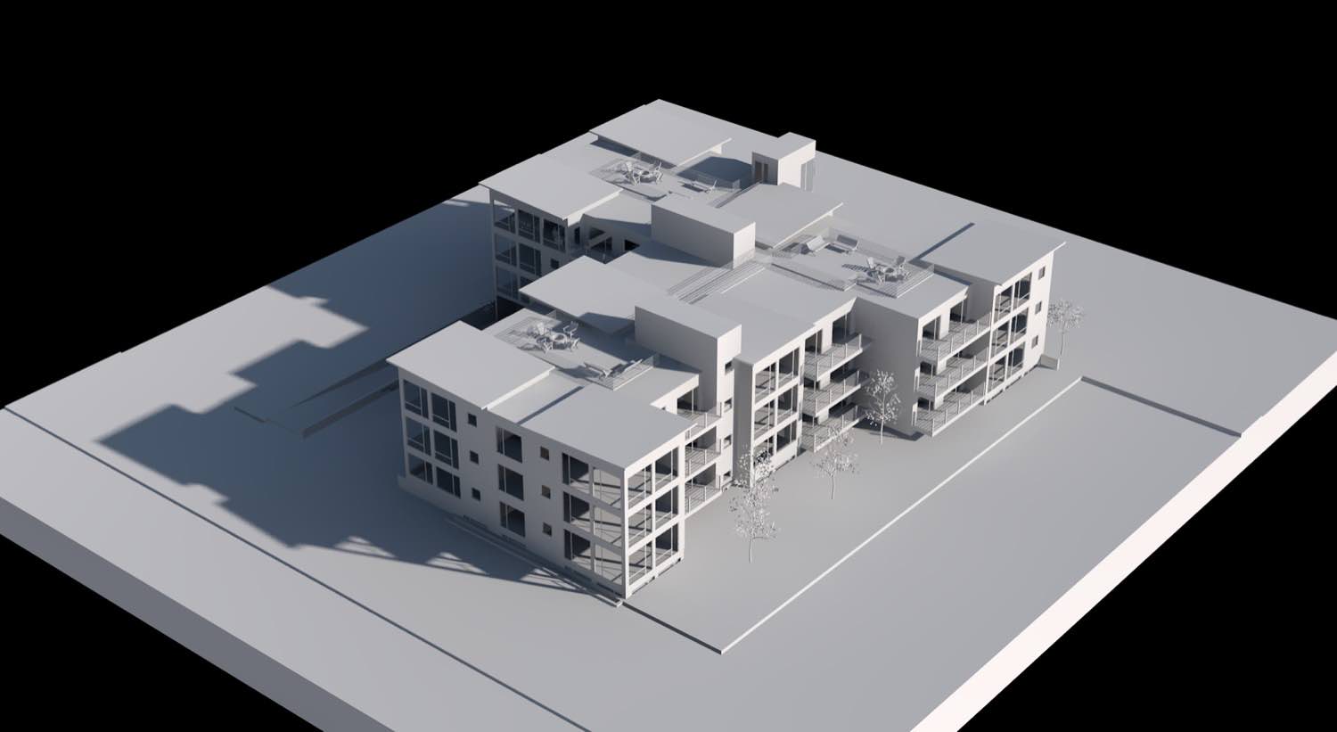 We're working with a mixed-use development that occupies a full block in town. The design separates residential from commercial through distinct volumes while maintaining visual coherence across the entire site.