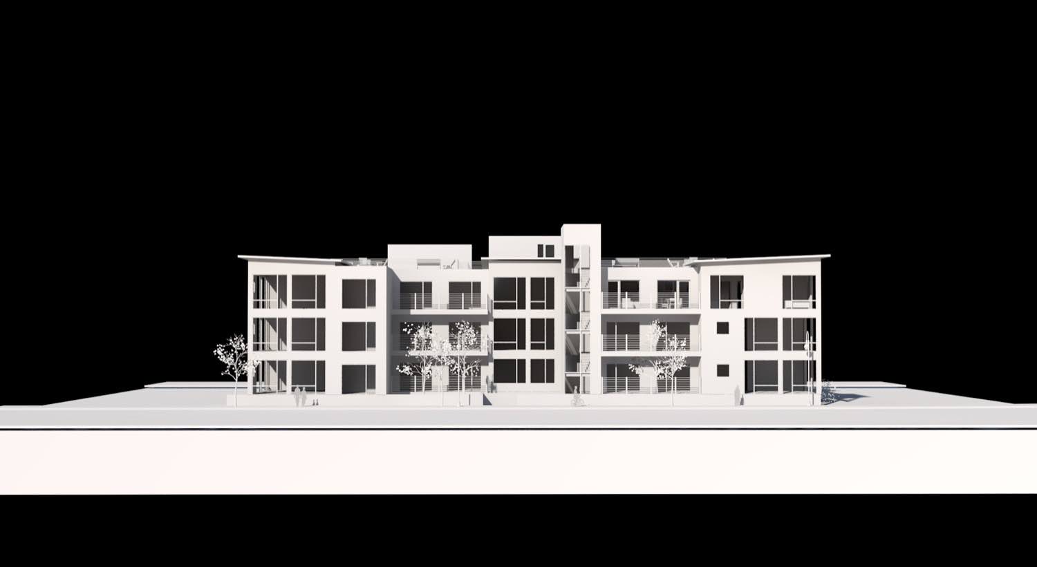 The street-facing elevations establish rhythm through regular window bays and recessed balconies. We've kept the fenestration consistent but varied the building masses to avoid repetition. Where units stack vertically, glass-railed balconies create depth in the facade and provide outdoor space for residents.
