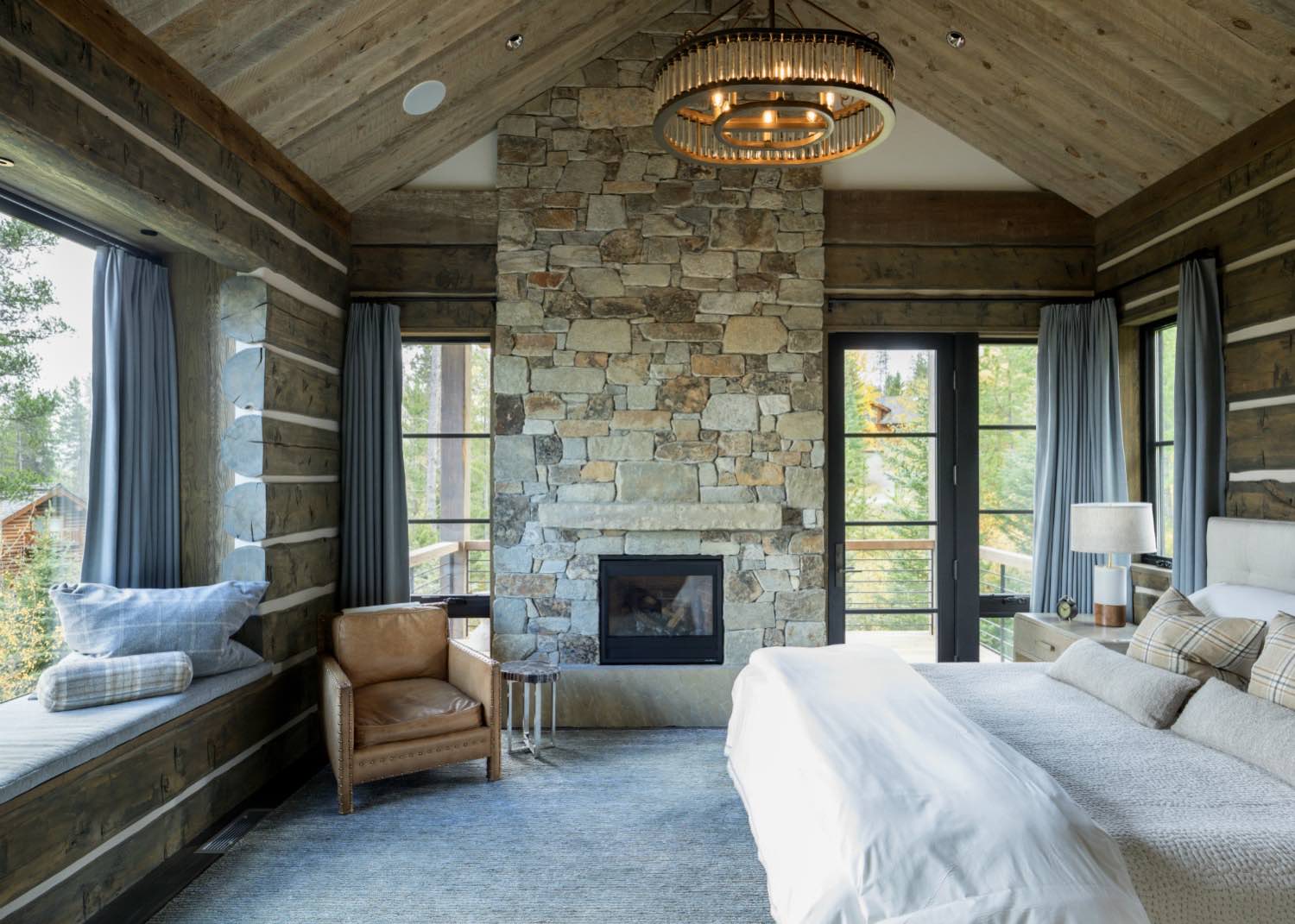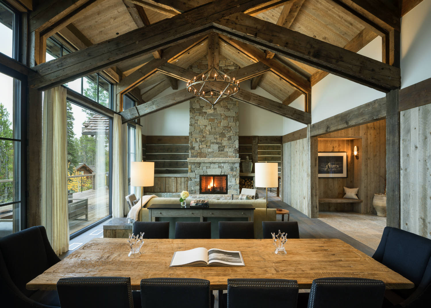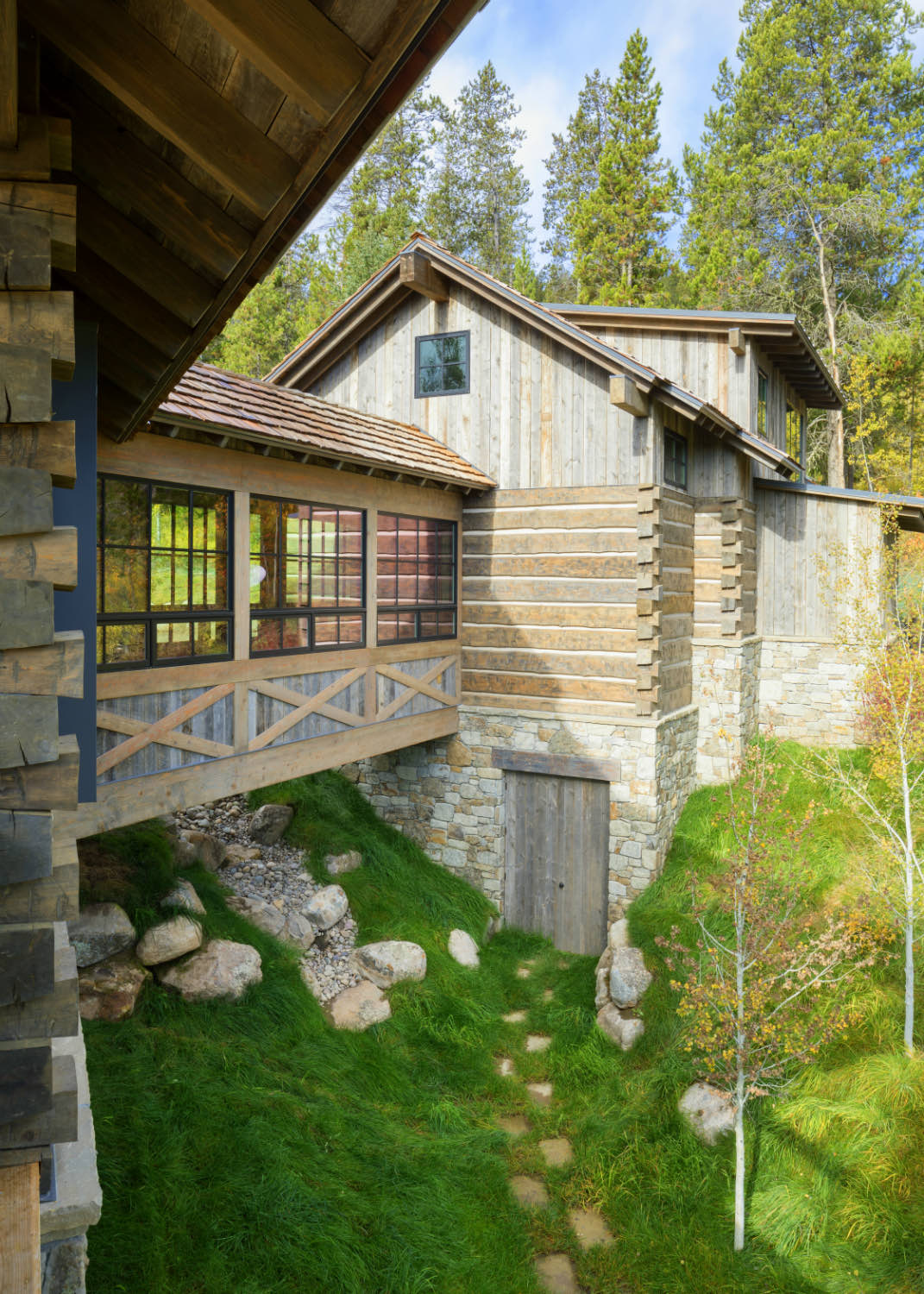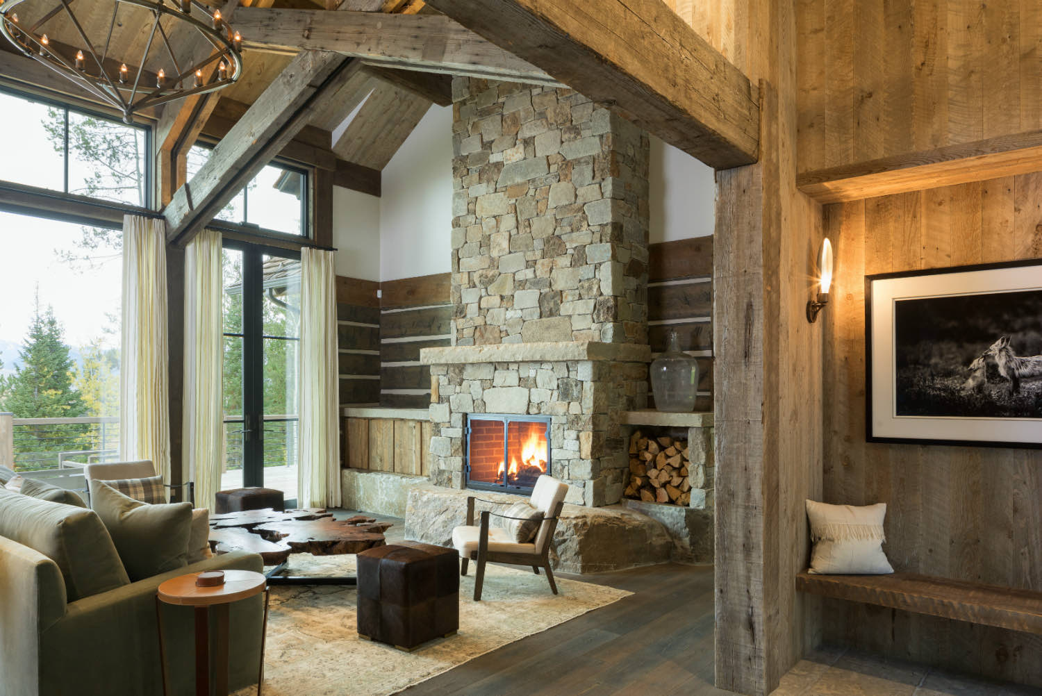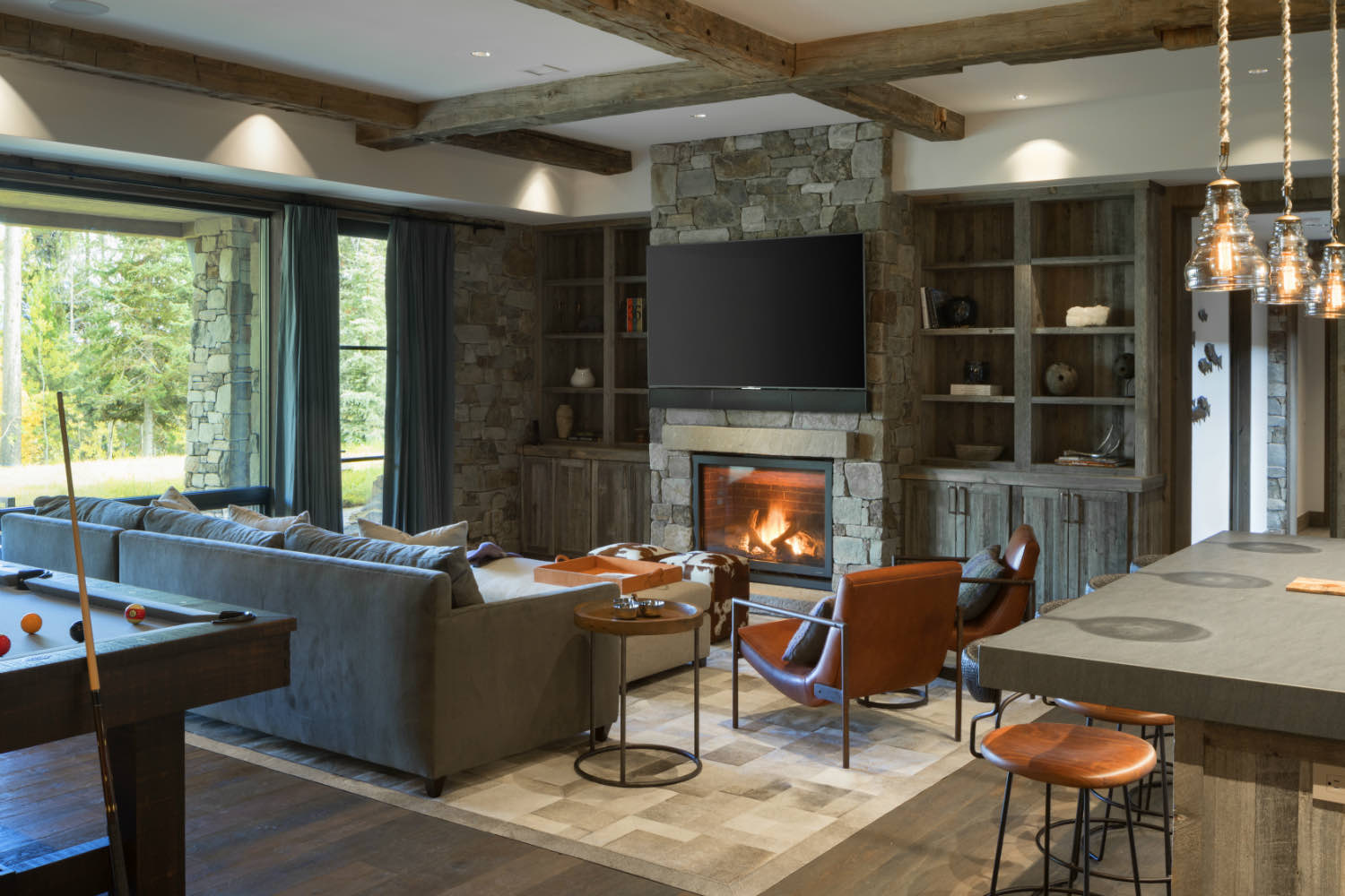 Stone elements ground the building both literally and visually. We used local stone for fireplace masses and foundation work where the building meets the ground. The weight and texture of stone balance the linear quality of the timber framing.